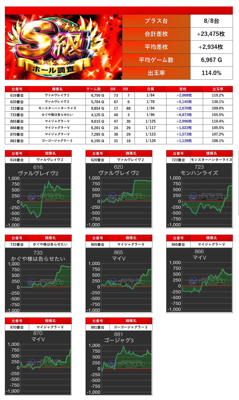 単品で投入された8台は平均差枚+2,934枚、出率114.0%と優秀な結果を記録。次回以降もこの単品投入は見逃せない。