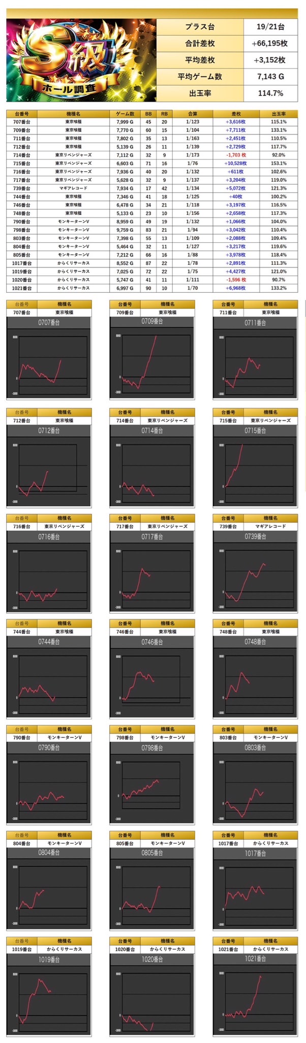「東京喰種」「東京リベンジャーズ」「モンキー」「マギレコ」「からくりサーカス」の5機種から21台の優秀台をpick upする。21台の平均差枚は+3,152枚で平均出率が114.7%とメイン機種らしいポテンシャルを見せた。