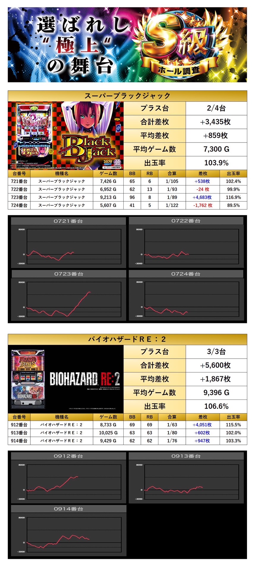 「スーパーブラックジャック」「バイオハザードRE:2」の2機種をpick upする。2機種7台の平均差枚は+1,291枚で平均出率が105.2%とコアな仕掛けにも関わらず安定した出率を確保していた。