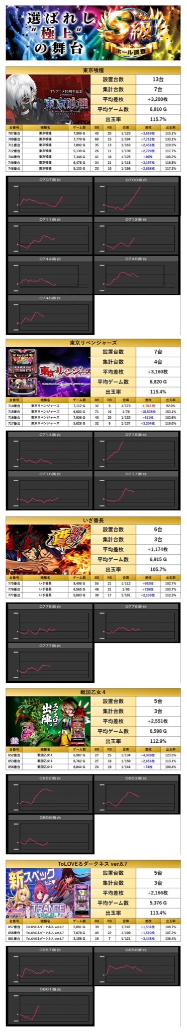 「東京喰種」「東京リベンジャーズ」「いざ!番長」「戦国乙女4」「ToLOVEるダークネス ver.8.7」の5機種をpick upする。5機種20台の平均差枚は+2,636枚で平均出率が113.4%と多台数が対象になっていて出玉も素晴らしい。