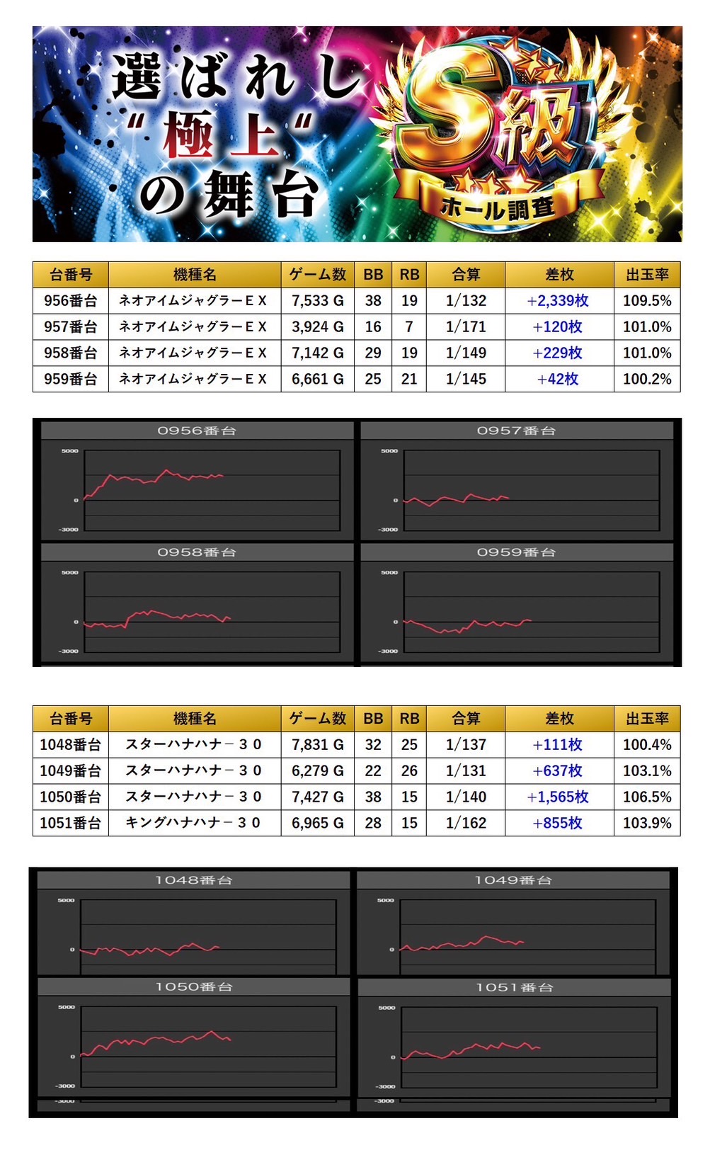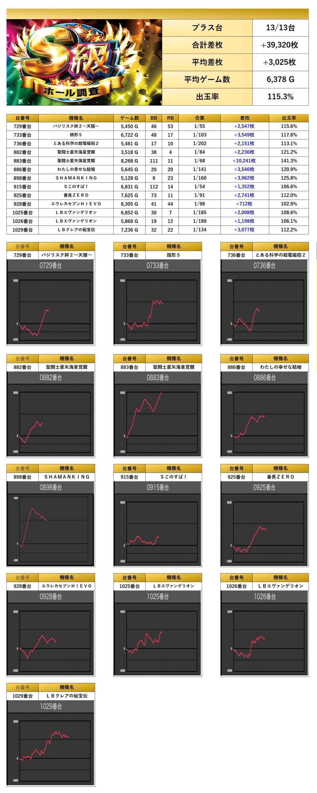 13台の平均差枚は+3,025枚で平均出率が115.3%と多彩な機種が随所で際立っていた。