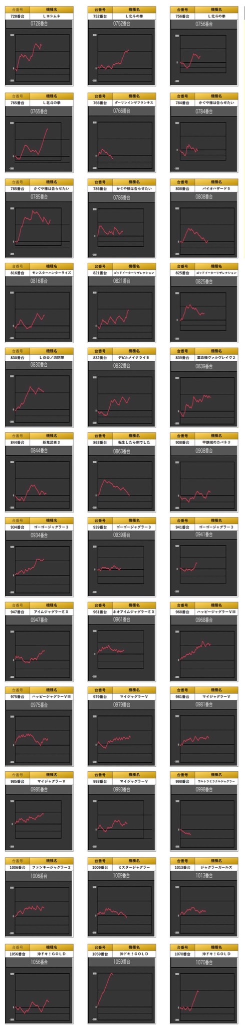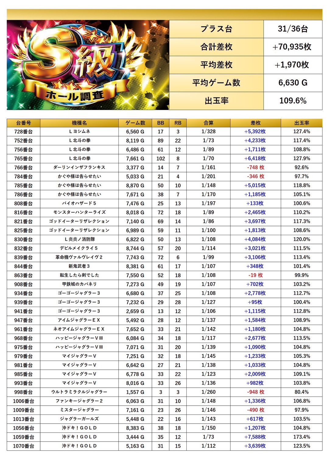 4台以上設置機種から優秀台を探すと36台をpick upすることができた。36台の平均差枚は+1,970枚で平均出率が109.6%と多彩な機種がpick upされ質も高い。