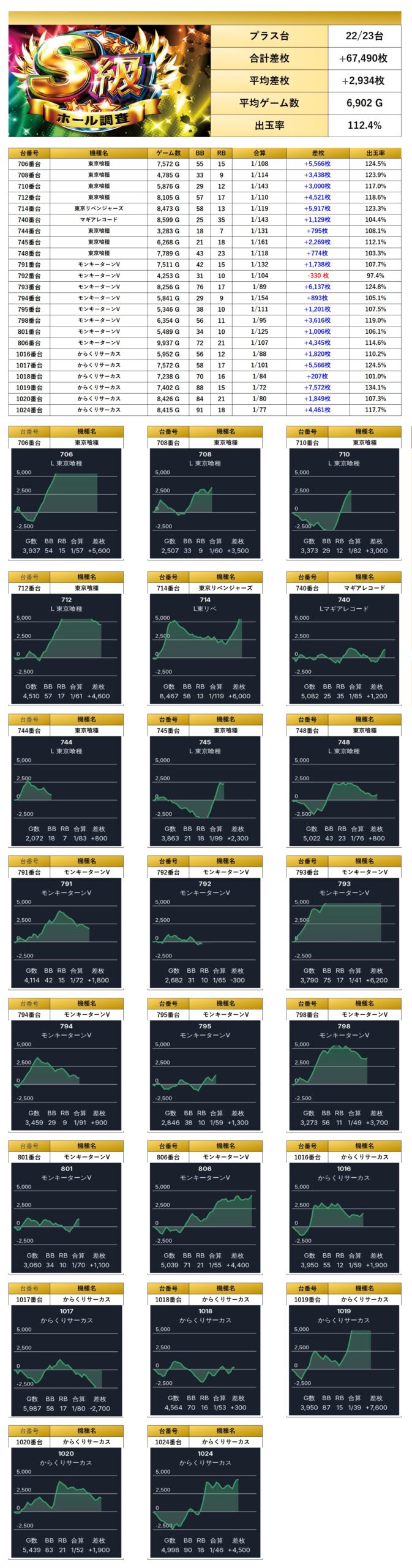 「東京喰種」「東京リベンジャーズ」「モンキー」「マギレコ」「からくりサーカス」の5機種から23台の優秀台をpick upする。23台の平均差枚は+2,934枚で平均出率が112.4%とメイン機種らしいポテンシャルを見せた。
