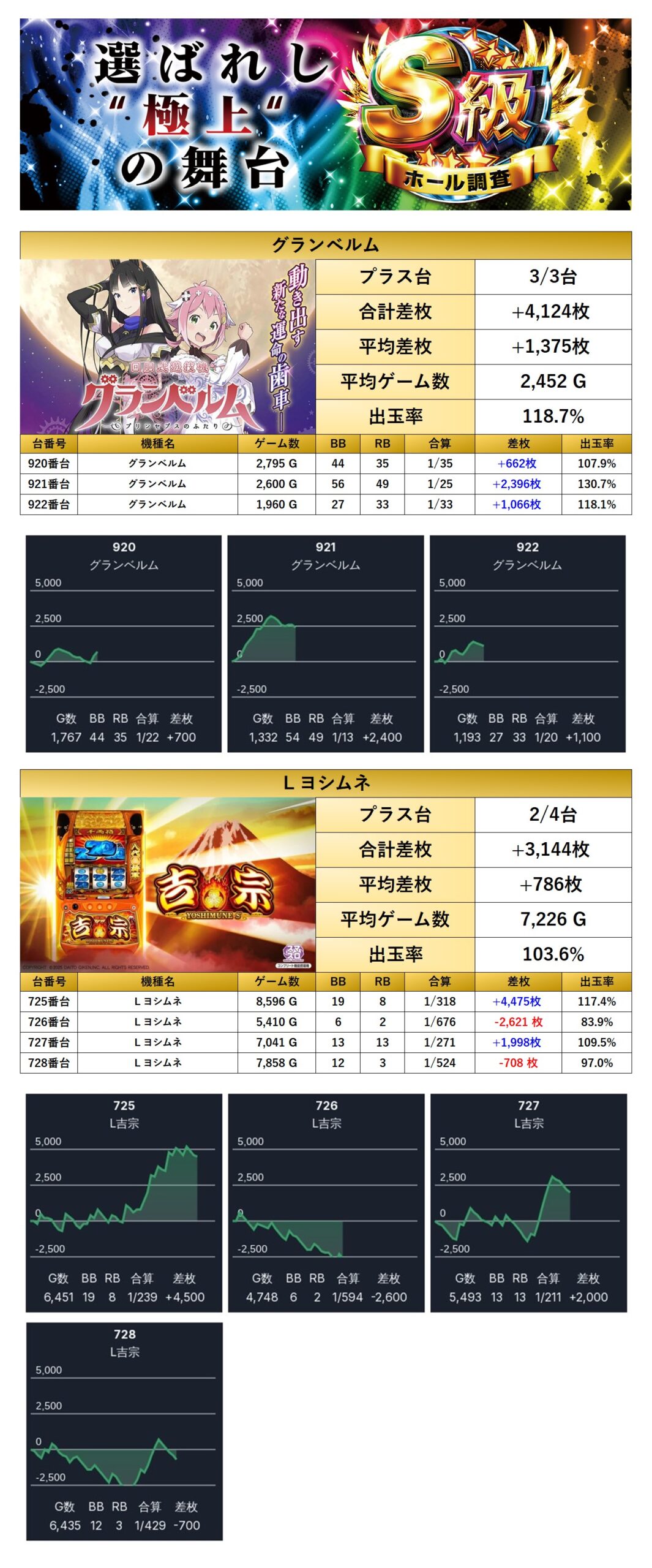 「グランベルム」「L吉宗」の2機種をpick upする。2機種7台の平均差枚は+1,038枚で平均出率が106.7%とコアな仕掛けにも関わらず安定した出率を確保していた。