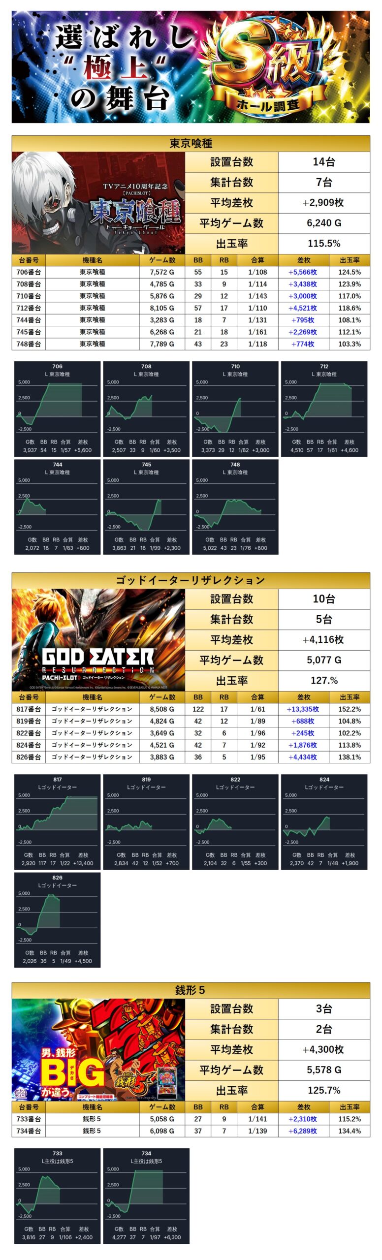 「東京喰種」「ゴットイーター」「銭形5」の3機種をpick upする。3機種14台の平均差枚は+3,539枚で平均出率が120.6%と多台数が対象になっていて出玉も素晴らしい。