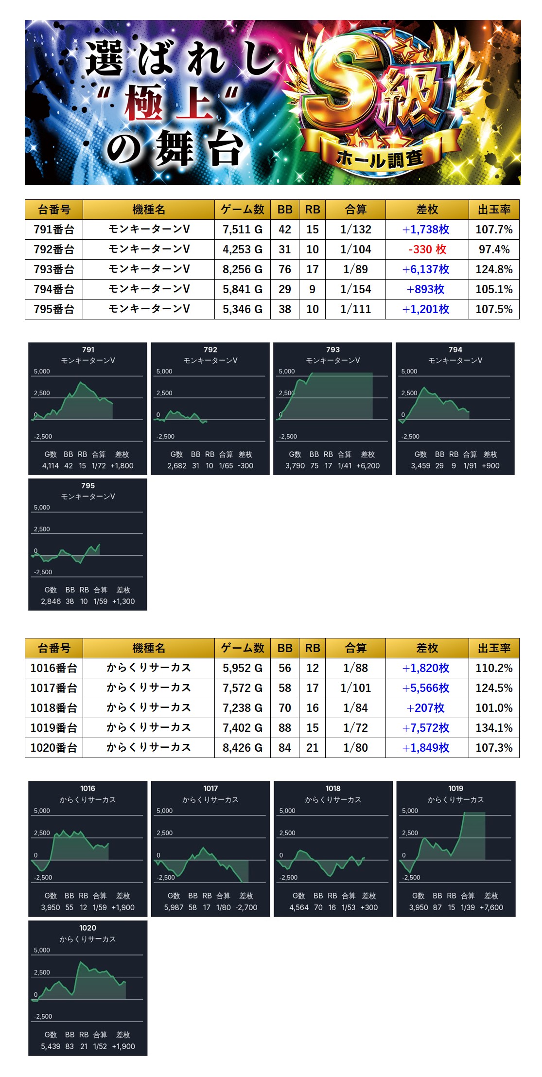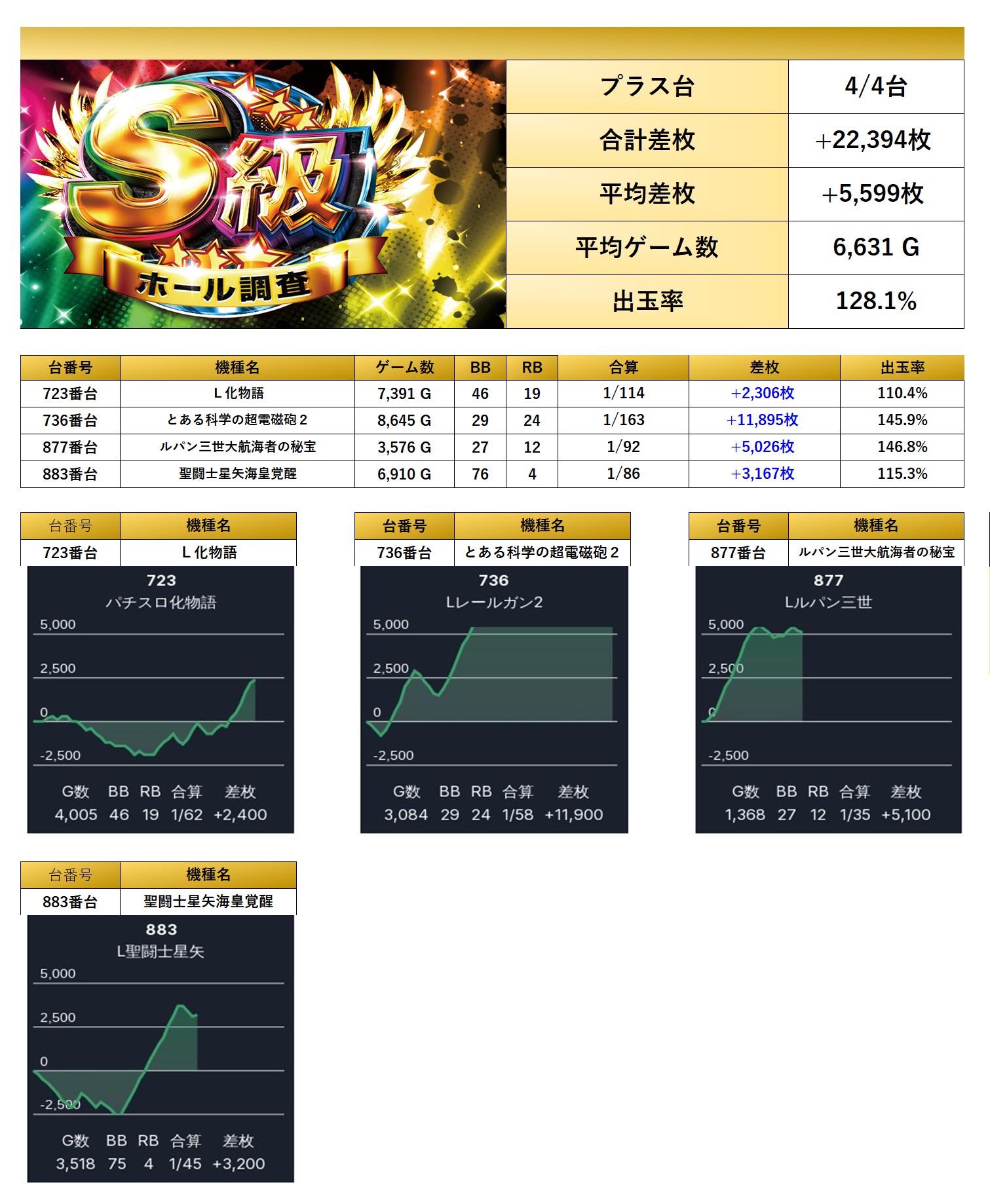 4台の平均差枚は+5,599枚で平均出率が128.1%と多彩な機種が随所で際立っていた。