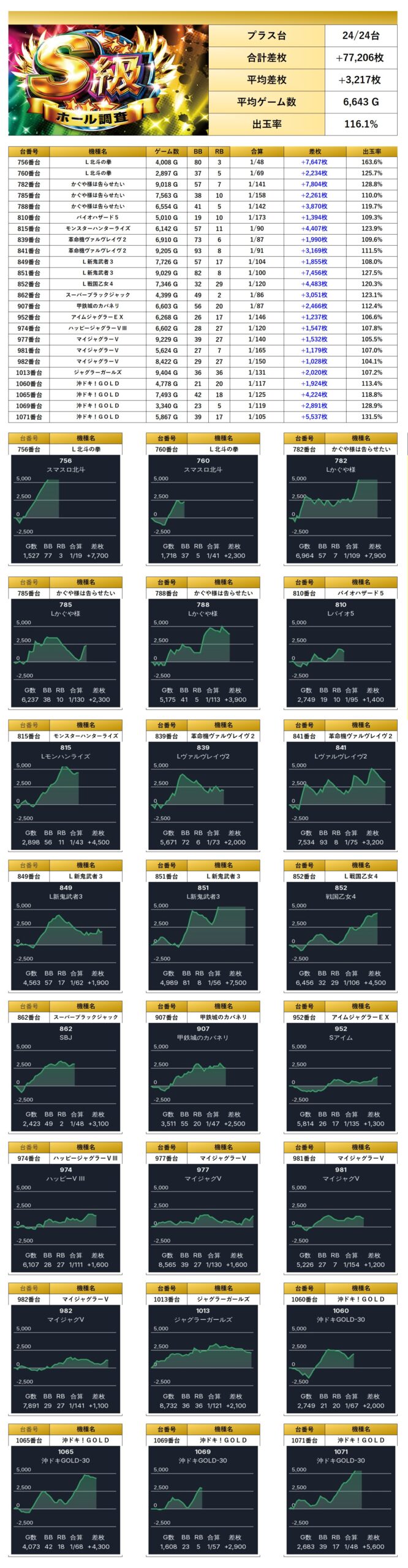 平均差枚は+2,665枚で平均出率が108.9%とサブ主力機種が対象になっていて、出率も素晴らしく並びらしい視覚的盛り上がりを見せていた。