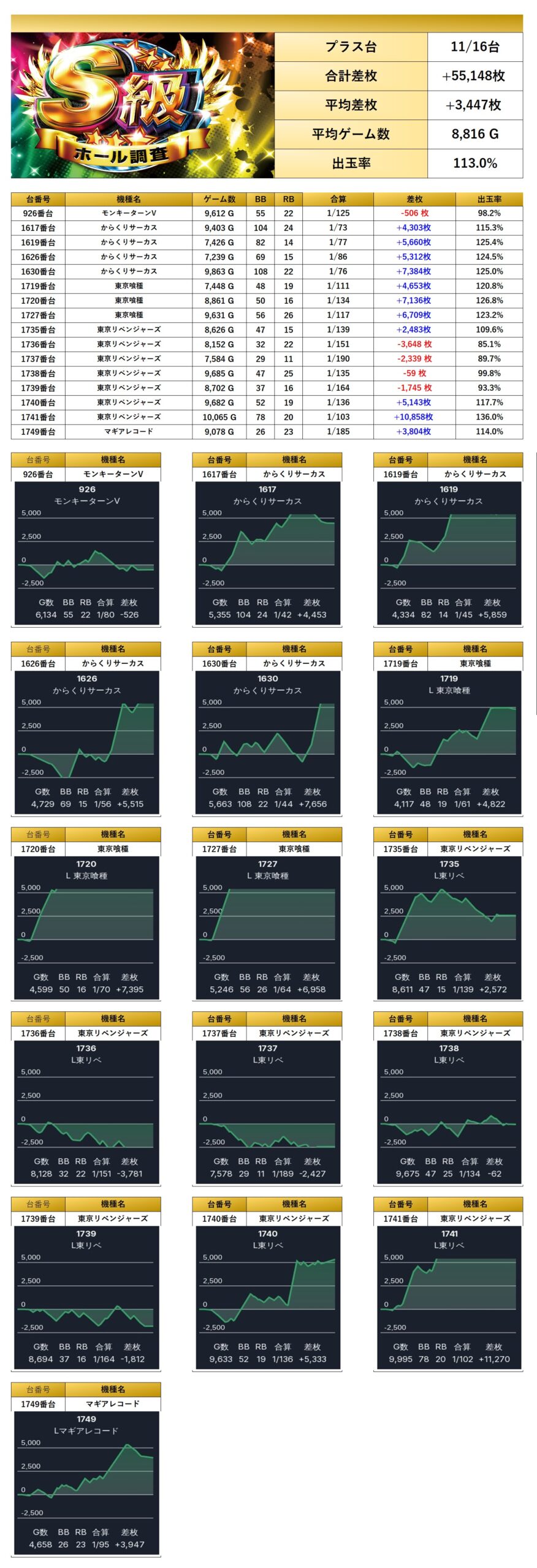 平均差枚は+3,042枚で平均出率が111.6%と、どの台も高水準で素晴らしい結果だった。