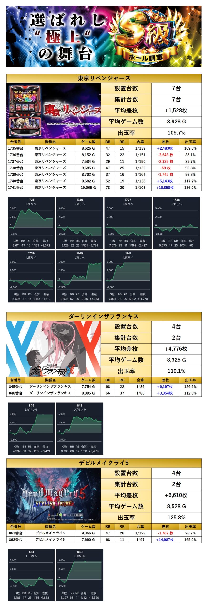 「東京喰種」「東京リベンジャーズ」「からくり」「マギレコ」「モンキー」から優秀台を16台pick upする。