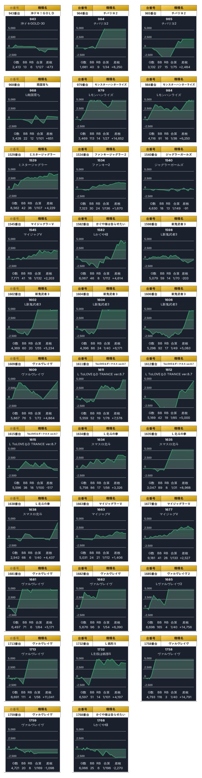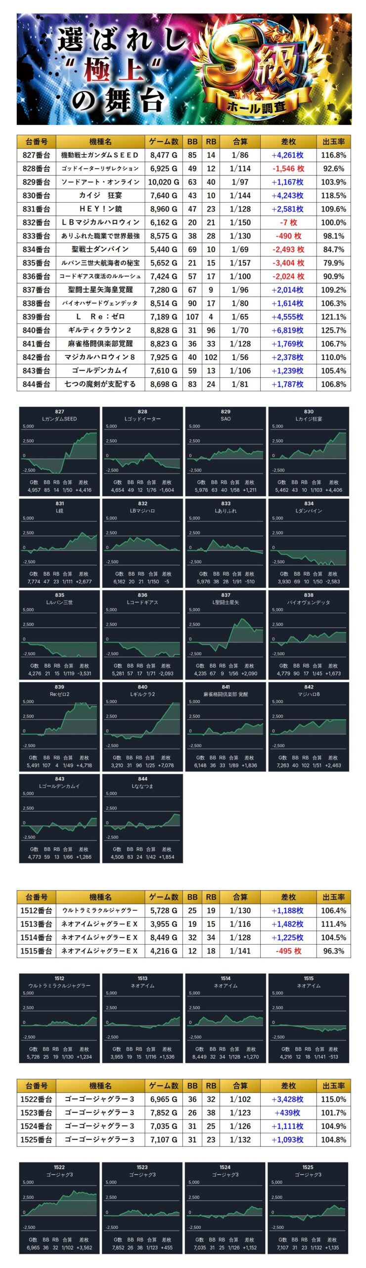 平均差枚は+1,305枚で平均出率が105.8%と安定した出玉を確保。18台も並びは驚きだ。ゴージャグは全台プラス域を記録。