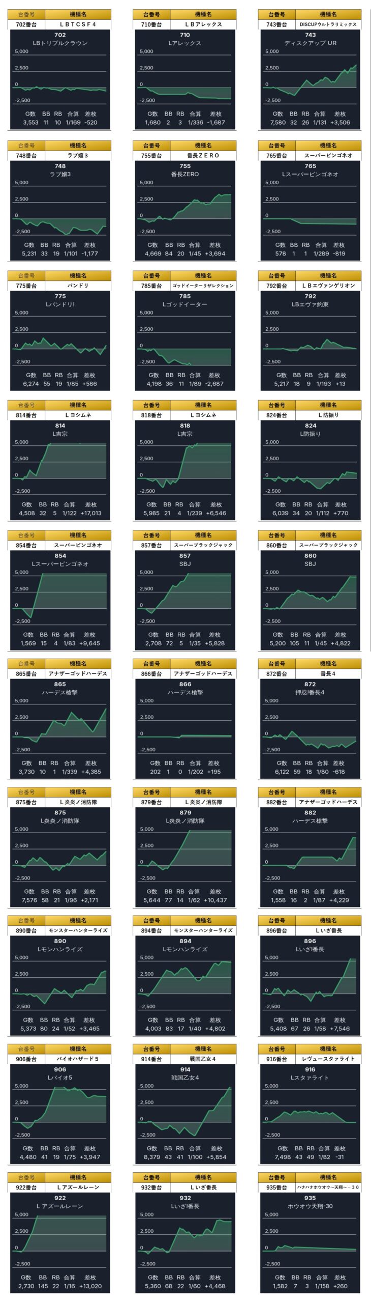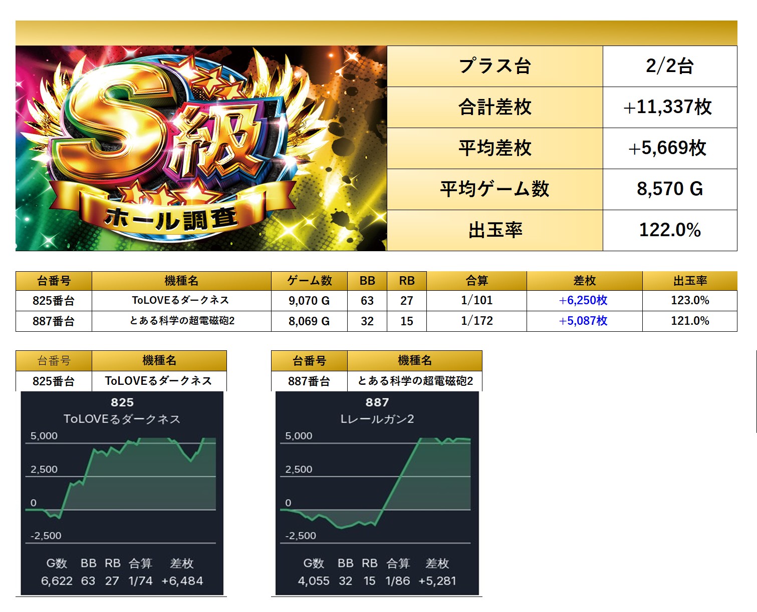 対象から2台をpick upする。2台の平均差枚は+5,669枚で平均出率が122.0%とこちらも素晴らしい出玉だった。