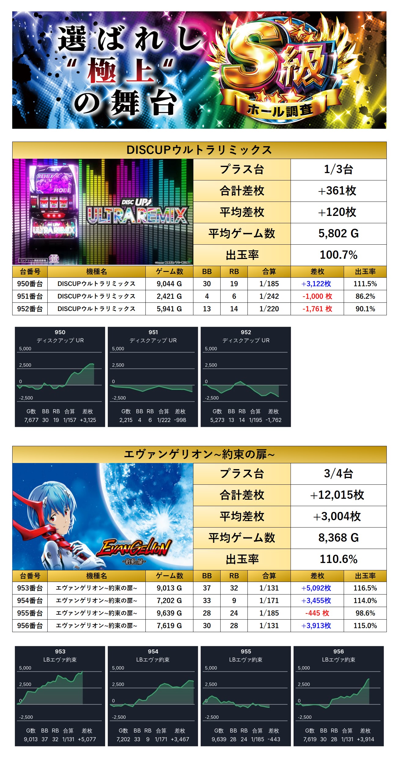「DISCUPウルトラリミックス」「エヴァンゲリオン~約束の扉~」の2機種7台をpick up。平均差枚+1,768枚、平均出率107.5%とLBエヴァ平均ゲーム数も8000Gを超え出率も素晴らしく、確かな存在感を放った。