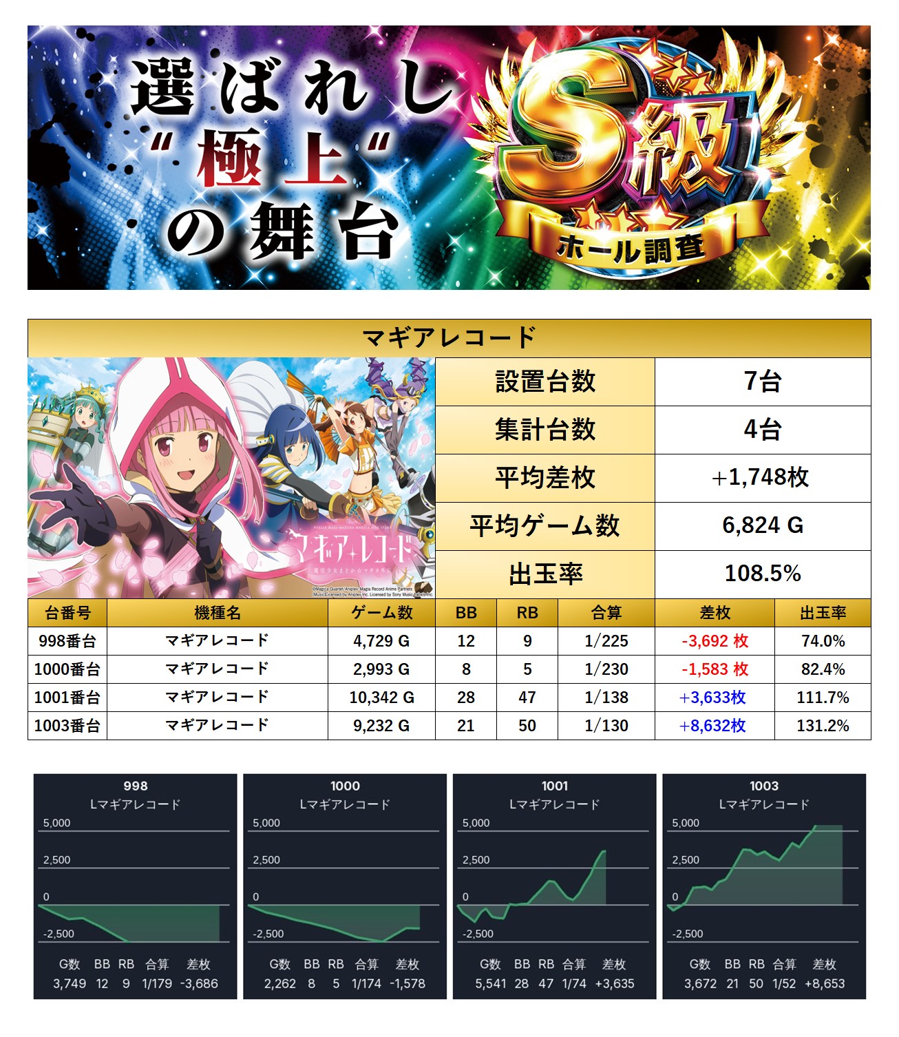 メイン機種でも登場した「マギレコ」の1機種4台がpick upされた。平均差枚+1,748枚、平均出率108.5%と局所的な爆発力がインパクトを与えた。