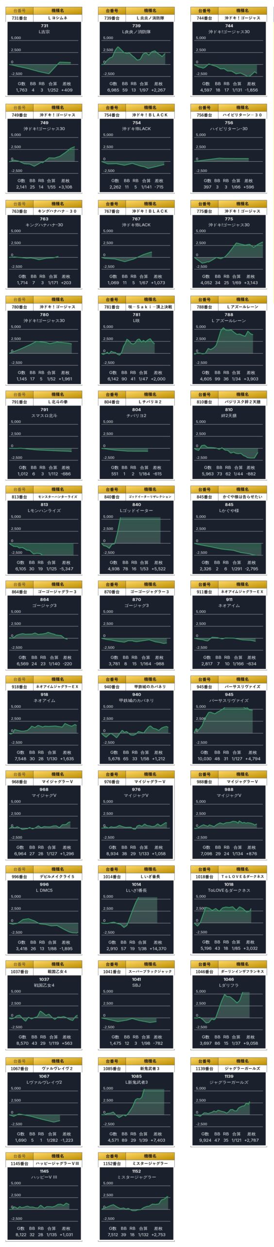 4台並びを2箇所pick up。平均差枚は+774枚、平均出率107.4%とからくりサーカスがポテンシャルを発揮できずに終わった。