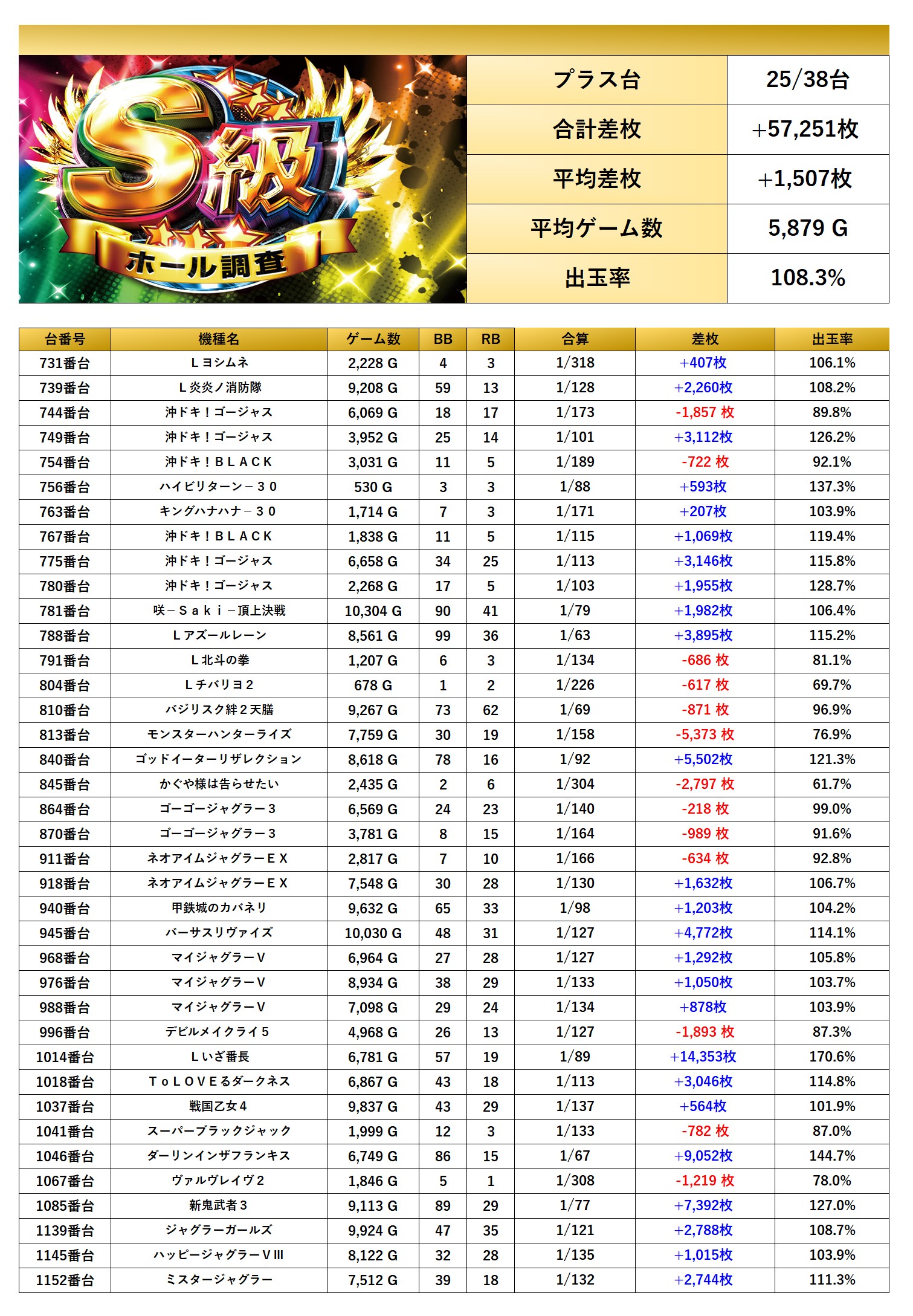 13回目となったS級虹では仕掛け全体を見ると設置台数の13.8%がpick upと安定した仕掛け量になっていた。個別にみると「メイン5機種」では打ち込みが足りず、「並び仕掛け」でも対象になっていたからくりサーカスがポテンシャルを発揮できずに終わり勿体ない。悔しい結果だ。「全台が好調な機種」からは2機種pick up、「設置の半分が好調な機種」はメイン機種からマギレコの1機種pick up。こちらもしっかり打ち込まれていたことをみるに、追える状況だった事が伺える。「4台以上の並び」が2箇所のpick up、「4台以上機種」からは38台のpick upとなった。