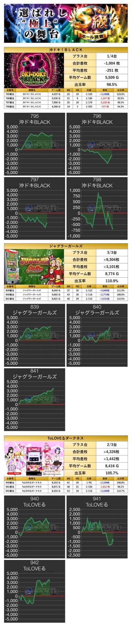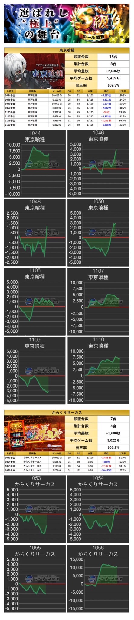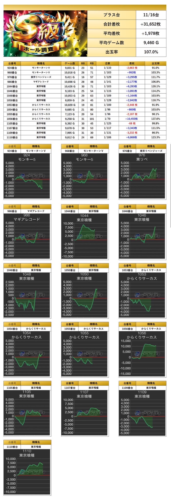 平均差枚+1,978枚、平均出率107.0%となった。多数の台がしっかり打ち込まれており、万回転が5台もあり、平均ゲーム数が9000G超えと勝率も素晴らしい結果に。