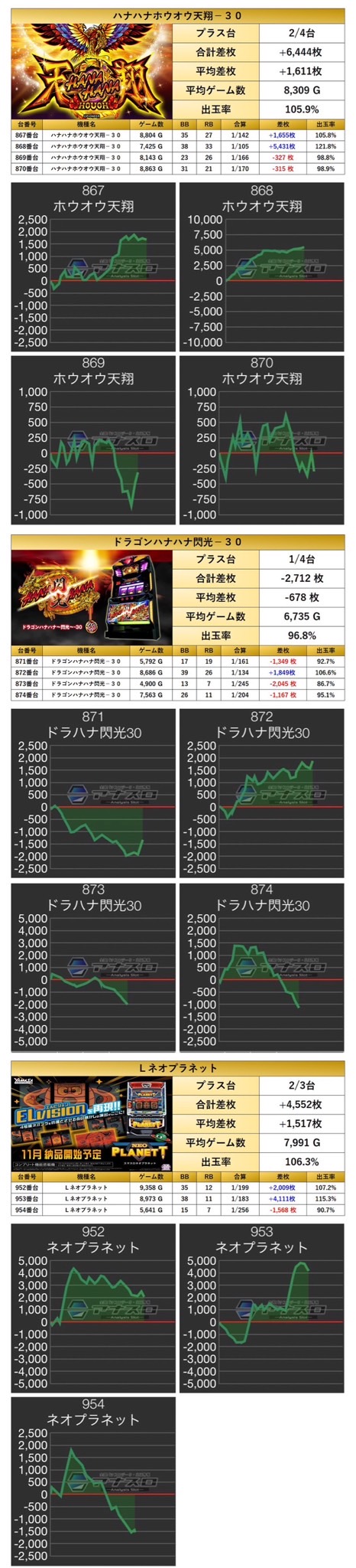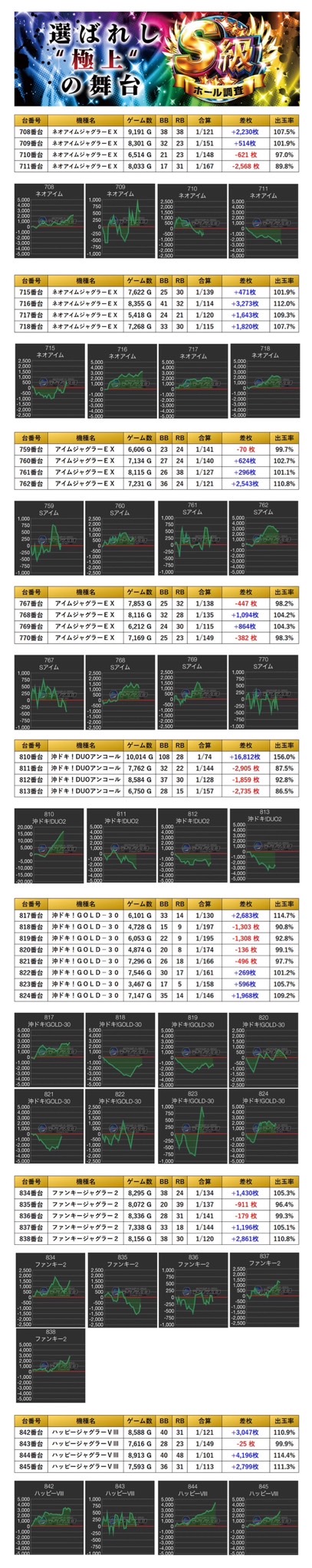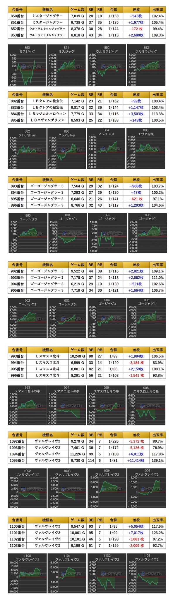 平均差枚+996枚、平均出率104.2%と下振れしている台もあるが、安定した出率だった。