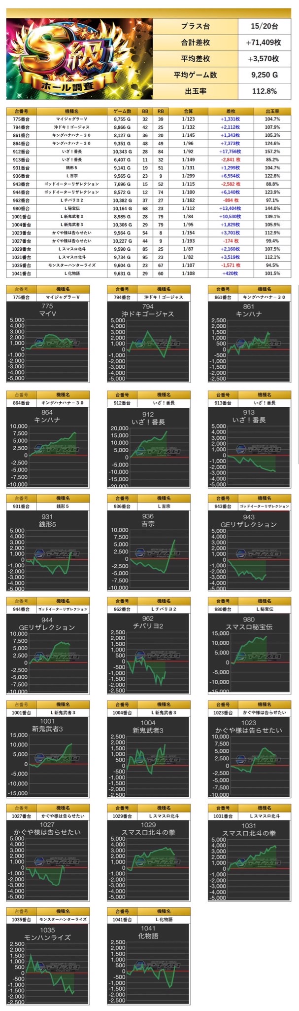 平均差枚+3,570枚、平均出率112.8%と素晴らしい出率となった。単品で散っている台20台の平均ゲーム数が9,000Gを超えてくるのは質の高さがあってこそだろう。