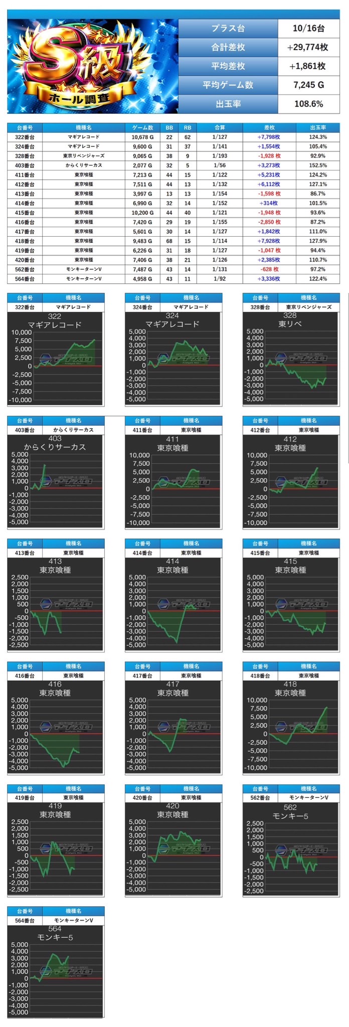 「からくり」「東京喰種」「マギレコ」「東京リベンジャーズ」「モンキー」の5機種から優秀台を16台pick upする。16台の平均差枚は+1,861枚で平均出率が108.6%と安定した出率だった。