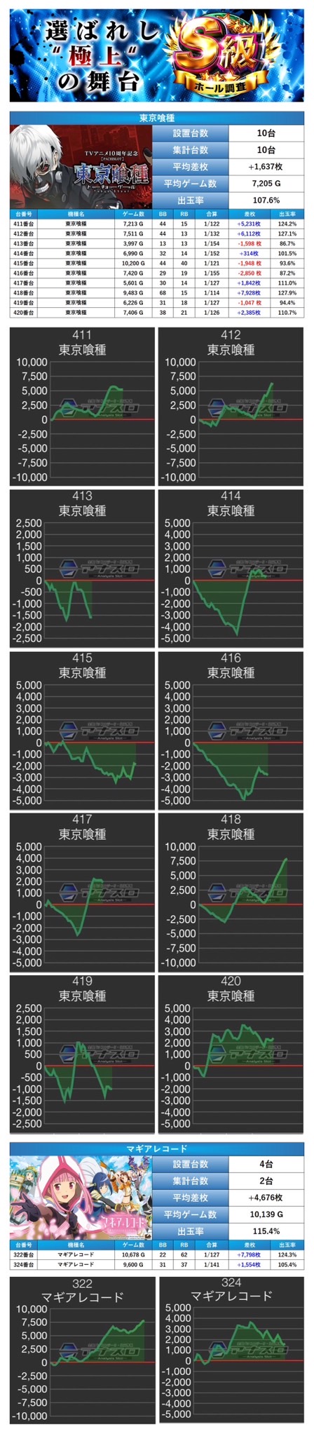 優秀台でも紹介した「東京喰種」「マギレコ」の2機種をpick upする。2機種12台の平均差枚は+2,143枚で平均出率が109.3%としっかりと打ち込まれ出率も安定していた。