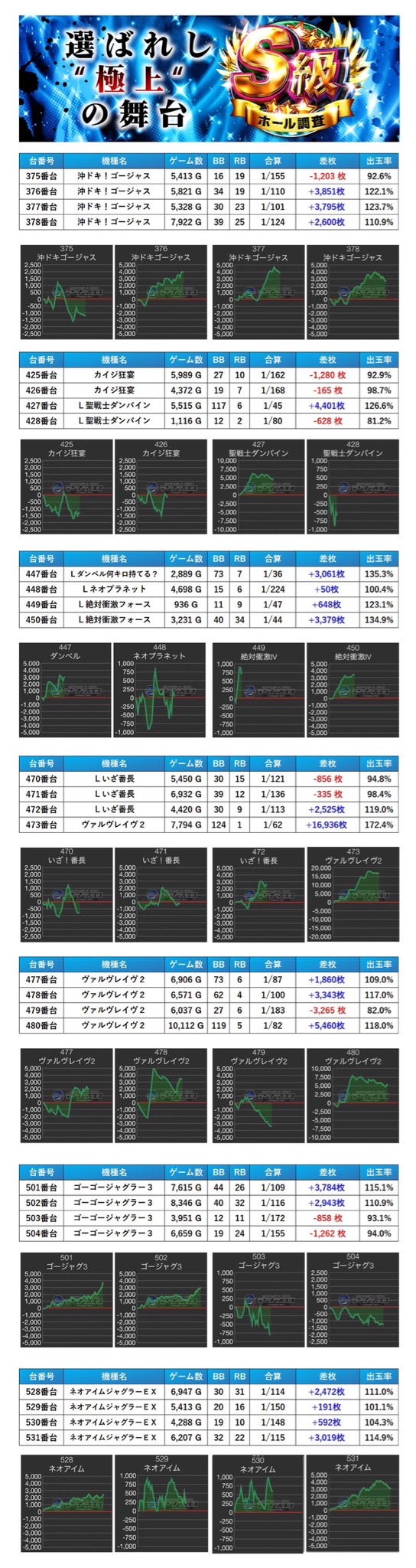 2回目の開催となったS級調査-青-では抽選78名/一般39名が集まった。今回の仕掛け量はpick up率22.9%にも及んだ。メイン機種を軸にニブイチ・並び仕掛けと盛り上がりを見せていた。並び仕掛けは機種跨ぎも多く見られ、反応している台の隣の台は気にしたほうが良さそうだ。法則に捉われない台では対象の9台が際立っていた。抽選が何番であってもチャンスがある仕掛けになっていた。全館差枚が平均が−4枚とマイナス域にはなってしまったが、次回からも注目していきたい。次回の取材にも期待が高まる。