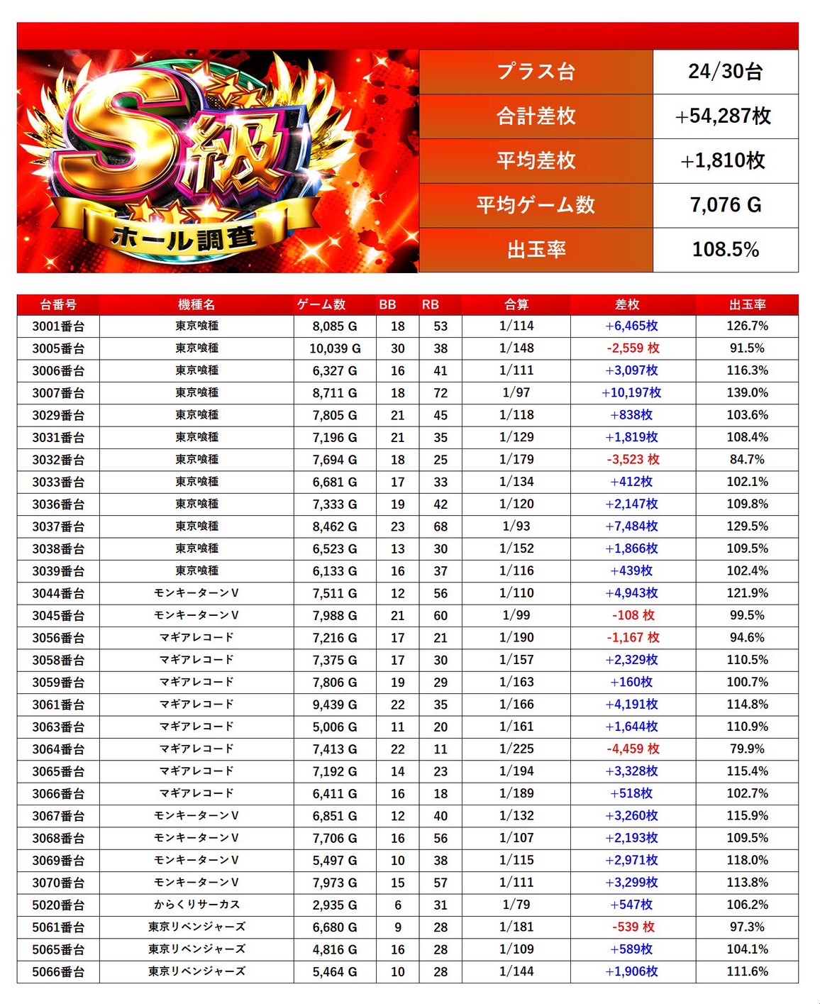 「東京喰種」「モンキー」「マギレコ」「東京リベンジャーズ」「からくり」のメイン主力機種から30台pick upする。30台の平均差枚は+1,810枚で平均出率が108.5%と出率はメイン機種らしい安定した結果になった。