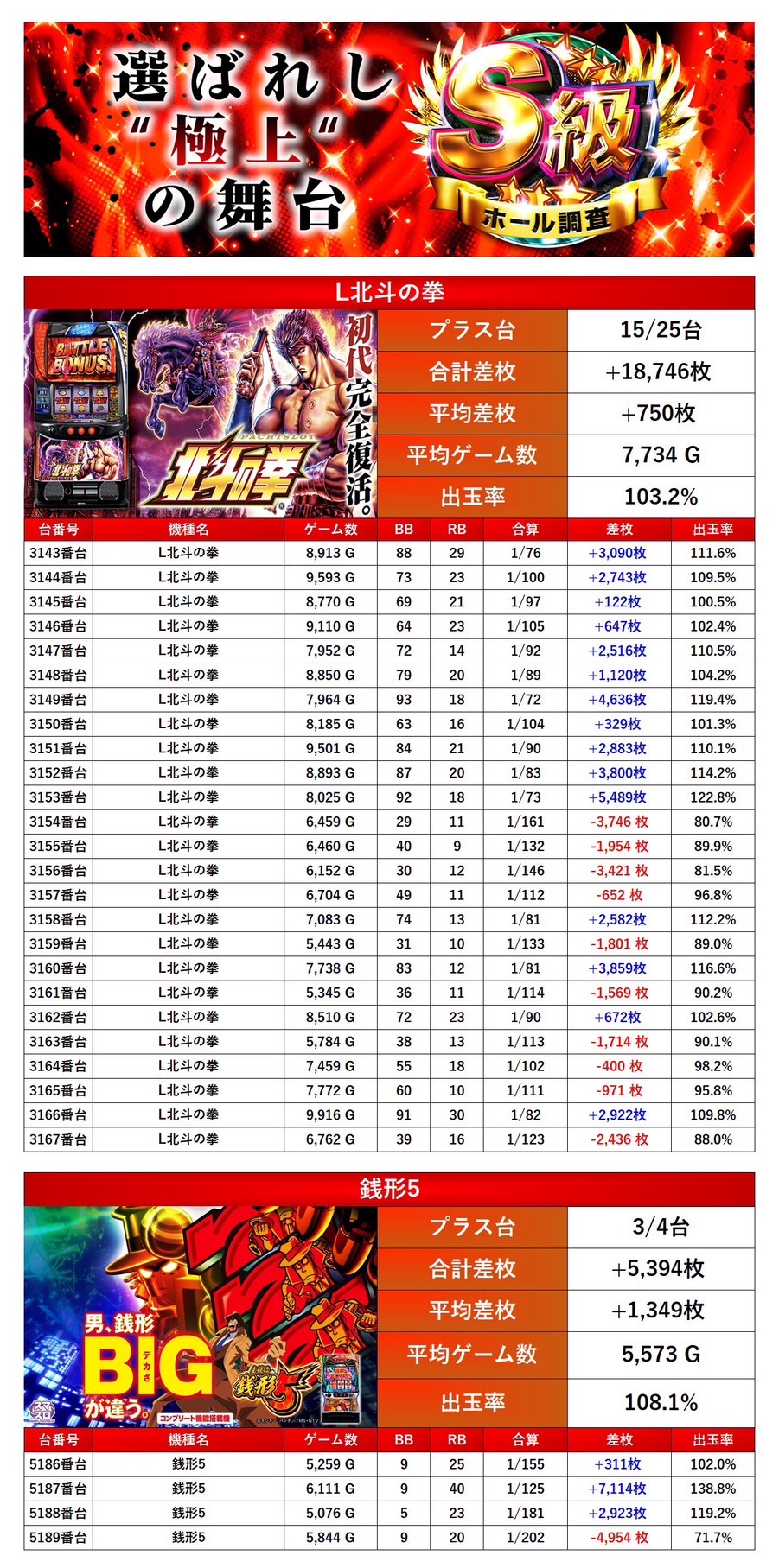 「北斗の拳」「銭形5」の2機種をpick upする。2機種29台の平均差枚は+832枚で平均出率が103.7%とサブ主力機種の北斗の拳がpick upされ多台数が対象になった。