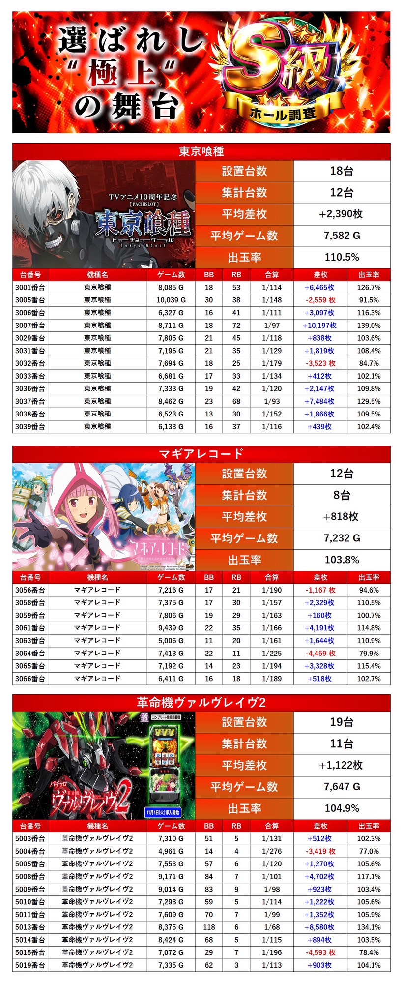 最優秀台でも紹介した「東京喰種」「マギレコ」さらに「ヴヴヴ2」の3機種をpick upする。3機種31台の平均差枚は+1,535枚で平均出率が106.8%とこちらも多台数が対象に盛り上がりを見せていた。
