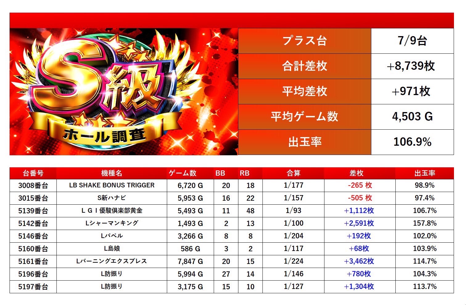 ・1台あたりの平均差枚数+1,580枚(平均出率107.8%)