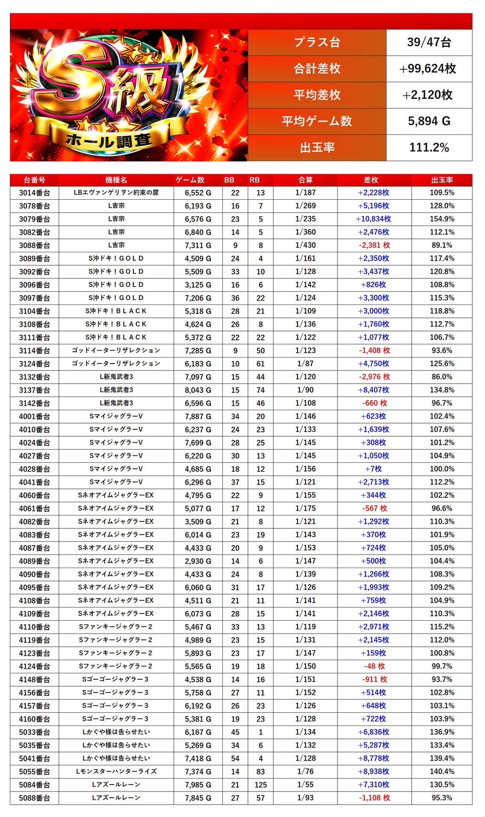 メダル機、スマスロから47台をpick upする。47台の平均差枚は+2,120枚で平均出率が111.2%だった。