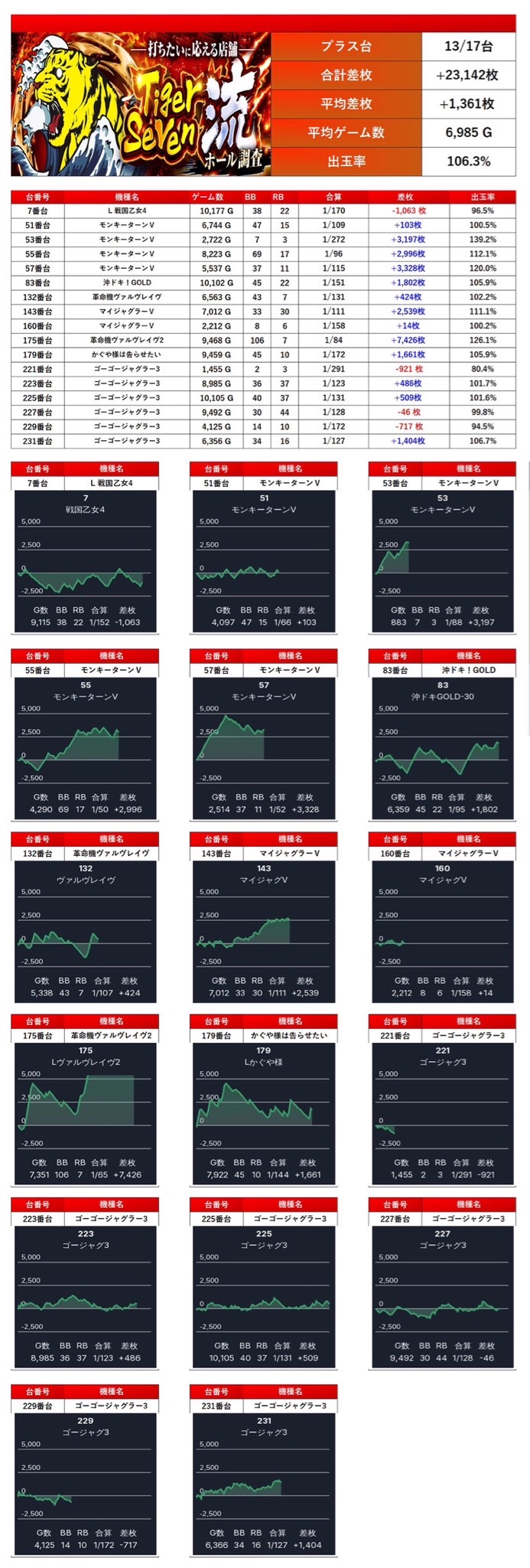 平均差枚+1,361枚/出率106.3%を記録。メイン機種だけでなくその他主力機種も織り交ぜた仕掛けになっていた。