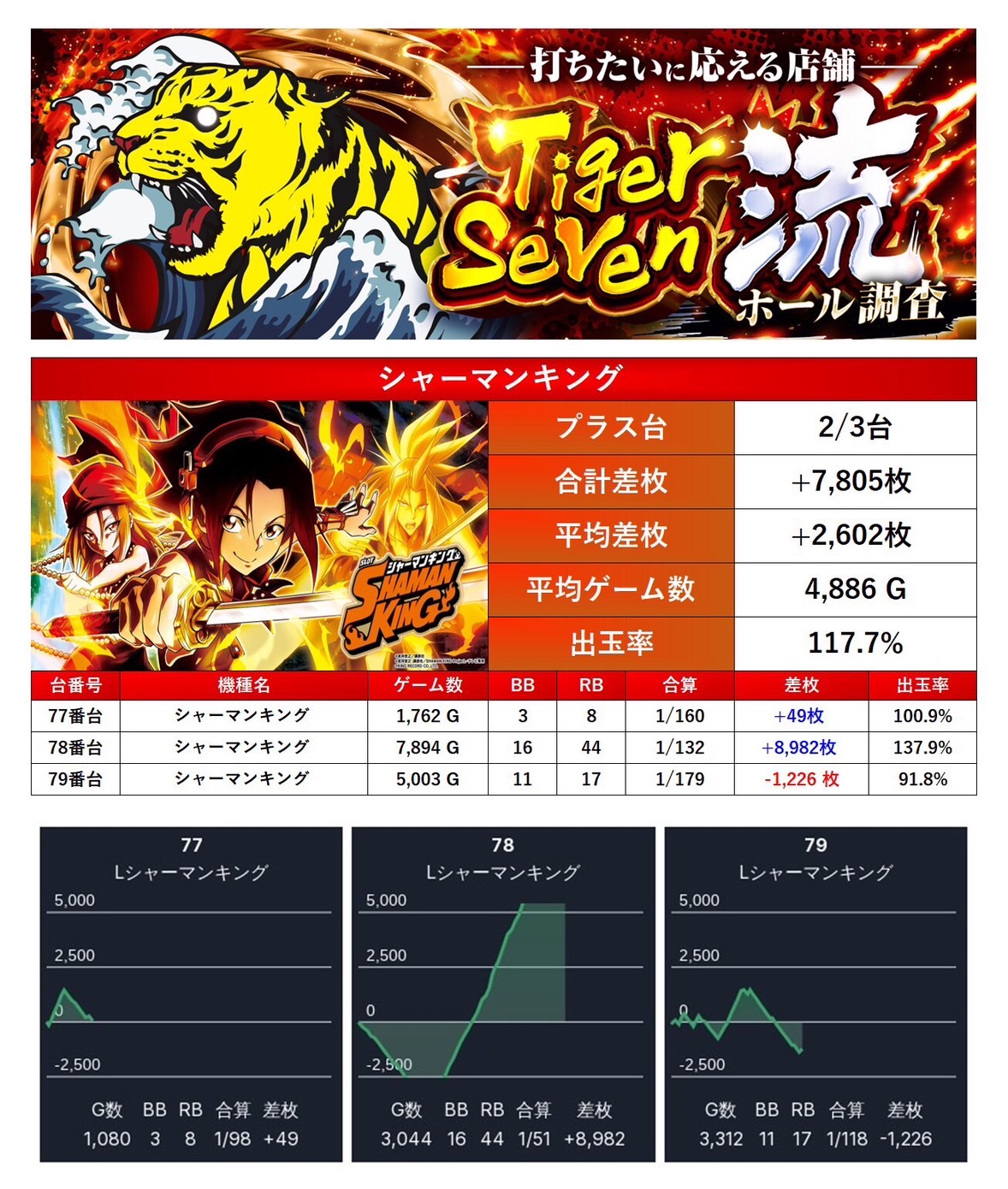 今回は「シャーマンキング」の1機種3台が全台系として好挙動を示し、平均差枚+2,602枚/出率117.7%と打ち込みが少ない台もあるが、圧巻出率をマーク。