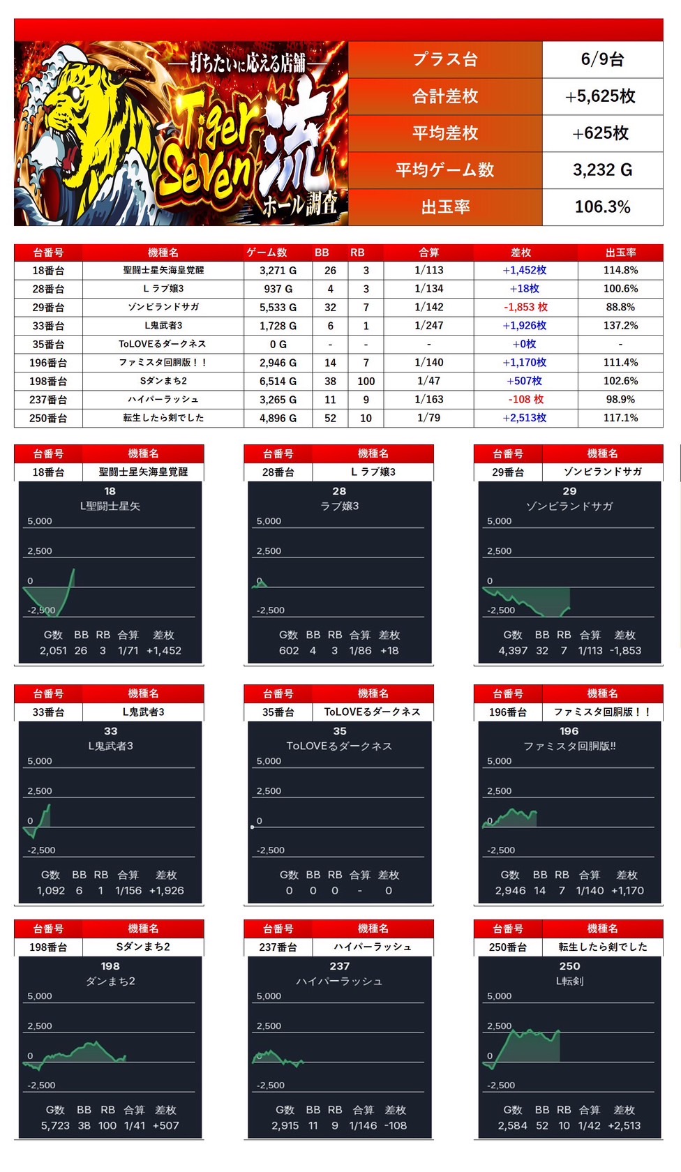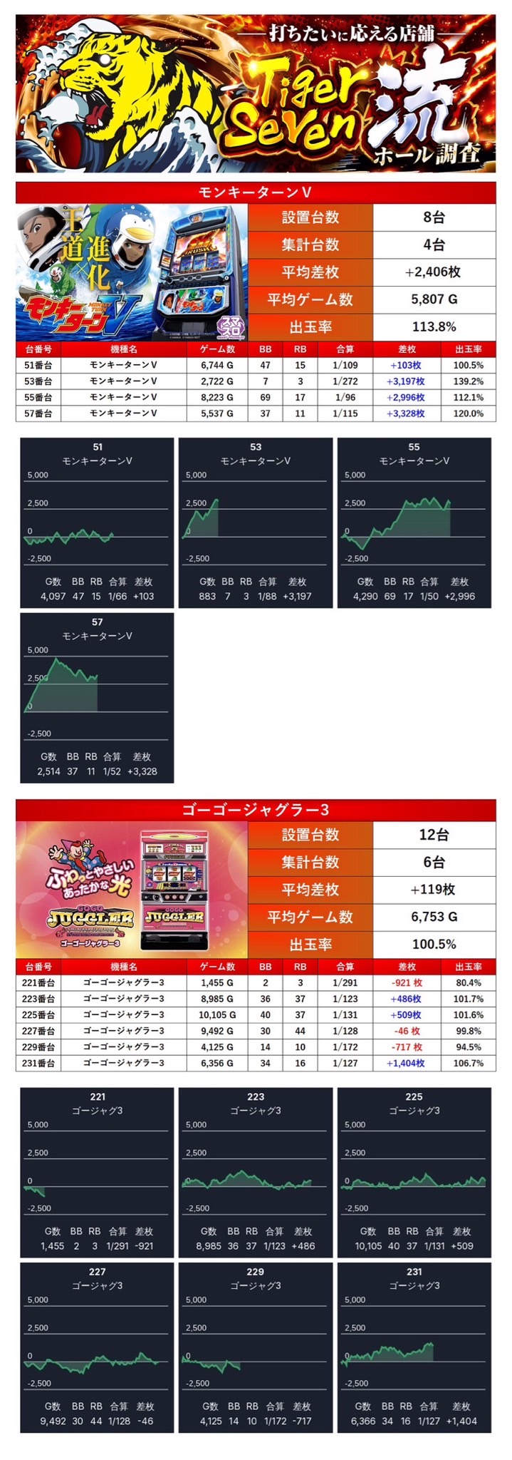 4回目の開催となるTiger Seven流ホール調査は抽選176名/一般6名と数多くのユーザーが足を運んでくれた。メインの仕掛けは型にはまらず毎度多彩な機種が対象になっている。全台系では出率117%を超え素晴らしい高水準な成績を残してくれた。ニブイチでは2機種pick up、そして2台設置以下は9台の優秀台が発見され、多彩な機種で多方向にチャンスが散りばめられた構成で抽選が何番であっても勝負が出来る環境だった。打ち込みが少なく、ポテンシャルを秘めたまま終わっている台も多数あったが安定した出率と仕掛け量だった。次回の調査も期待している。