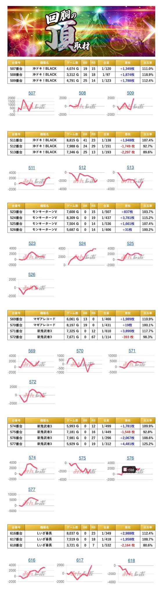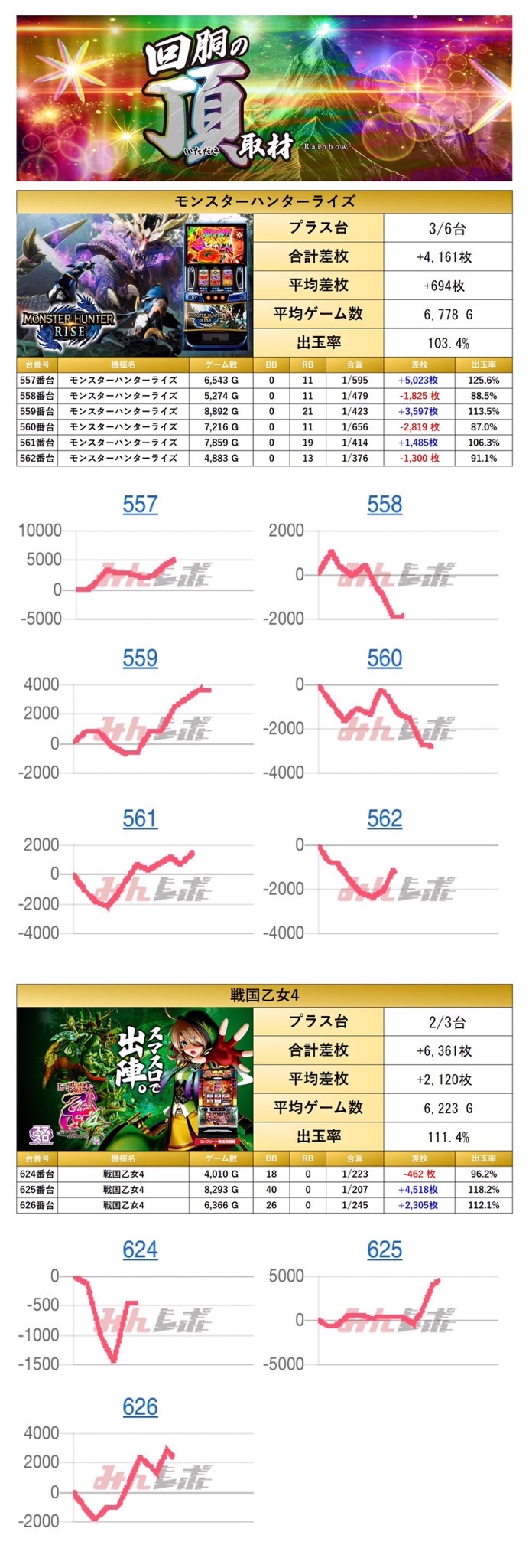 「モンハンライズ」「戦国乙女4」の2機種をpick upする。2機種の平均差枚は+1,169枚で平均出率が105.9%だった。
