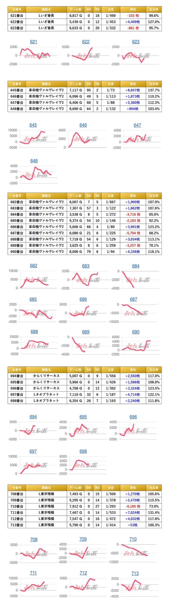 スマスロ、メダル機各所から3台並びを4箇所、4台並びを4箇所、5台並びを1箇所、6台並びを1箇所、9台並びを1箇所の計11箇所を見つけることができた。11箇所の平均差枚は+1,331枚で平均出率が106.7%だった。