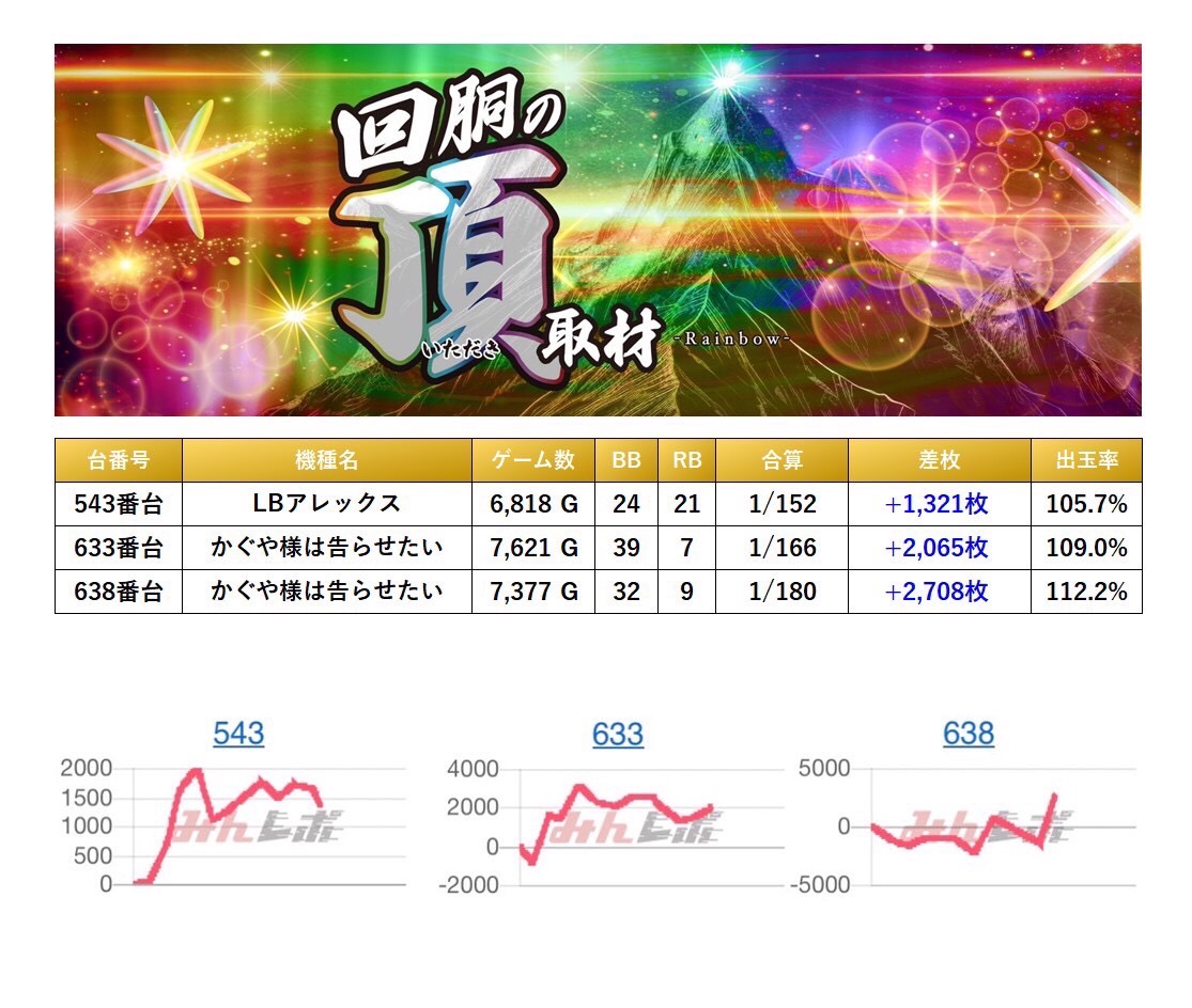 対象から3台をpick upする。3台の平均差枚は+2,031枚で平均出率が109.0%だった。