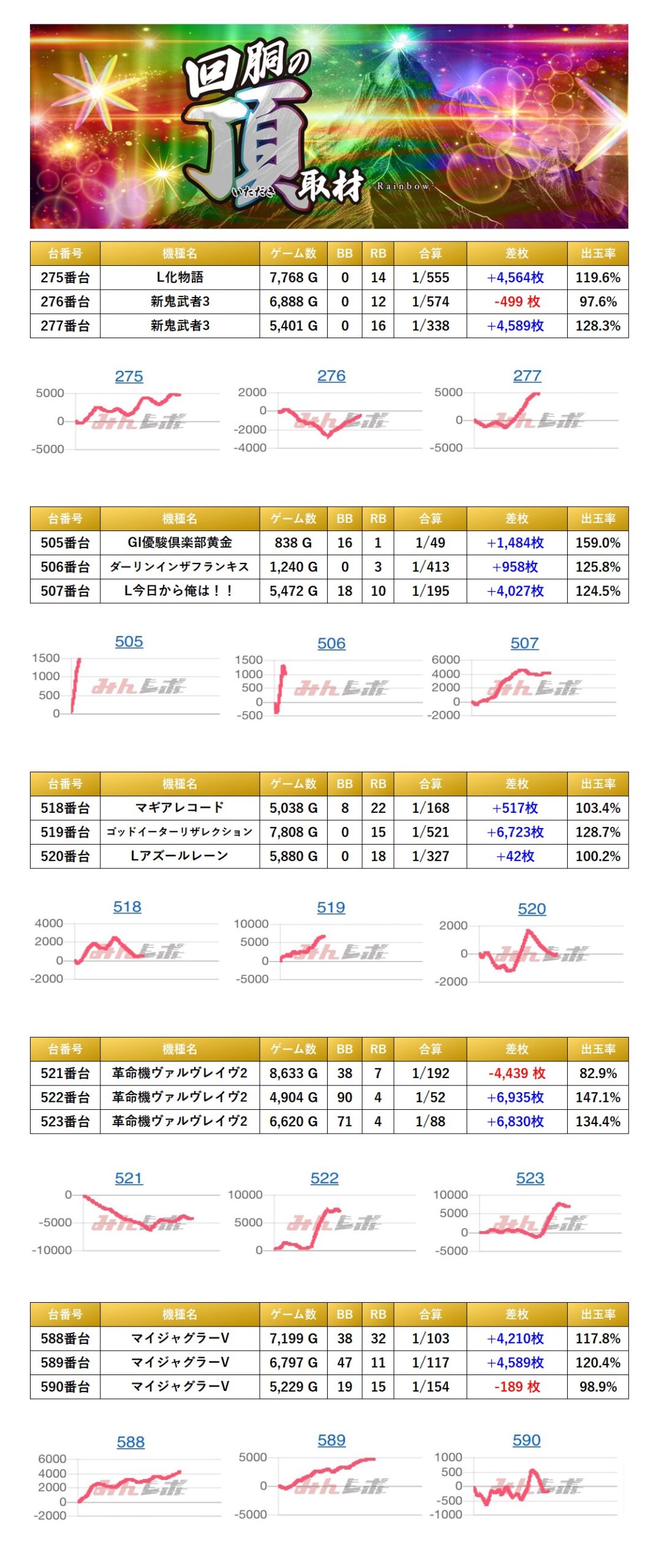 各所から3台並びを計5箇所を見つけることができた。平均差枚は+2,689枚で平均出率が115.4%だった。