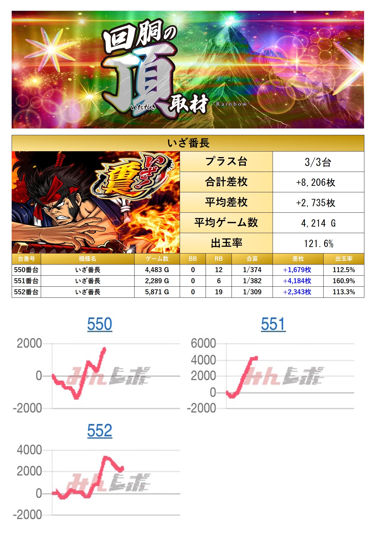 「いざ!番長」の1機種をpick upする。1機種3台の平均差枚は+2,735枚で平均出率が121.6%だった。