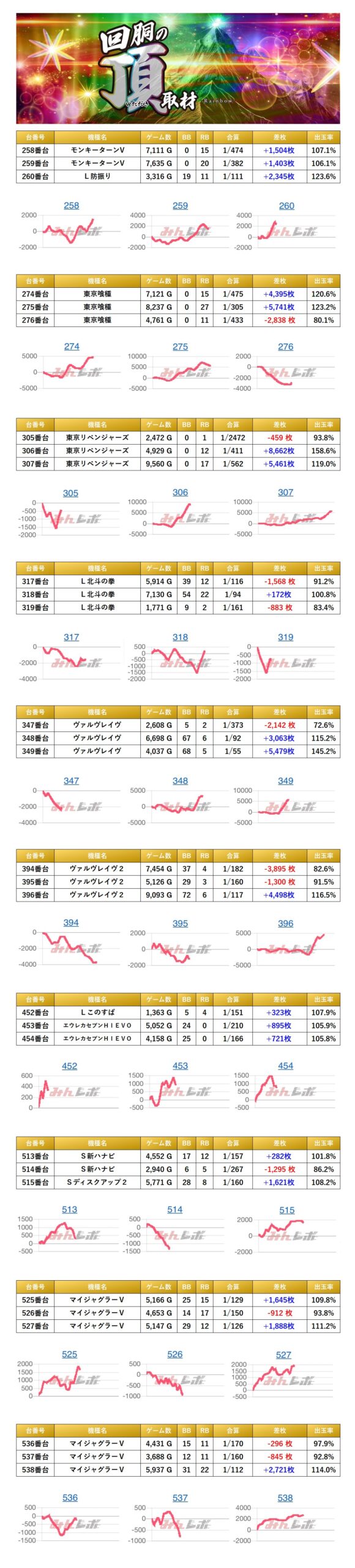 3台並びを計10箇所見つけることができた。10箇所の平均差枚は+1,213枚で平均出率が107.5%だった。