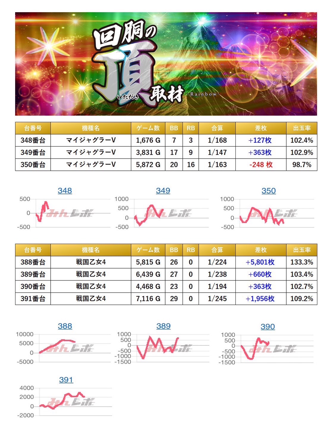 3台並びを1箇所、4台並びを1箇所の計3箇所を見つけることができた。3箇所平均差枚は1,289枚で平均出率が108.4%だった。