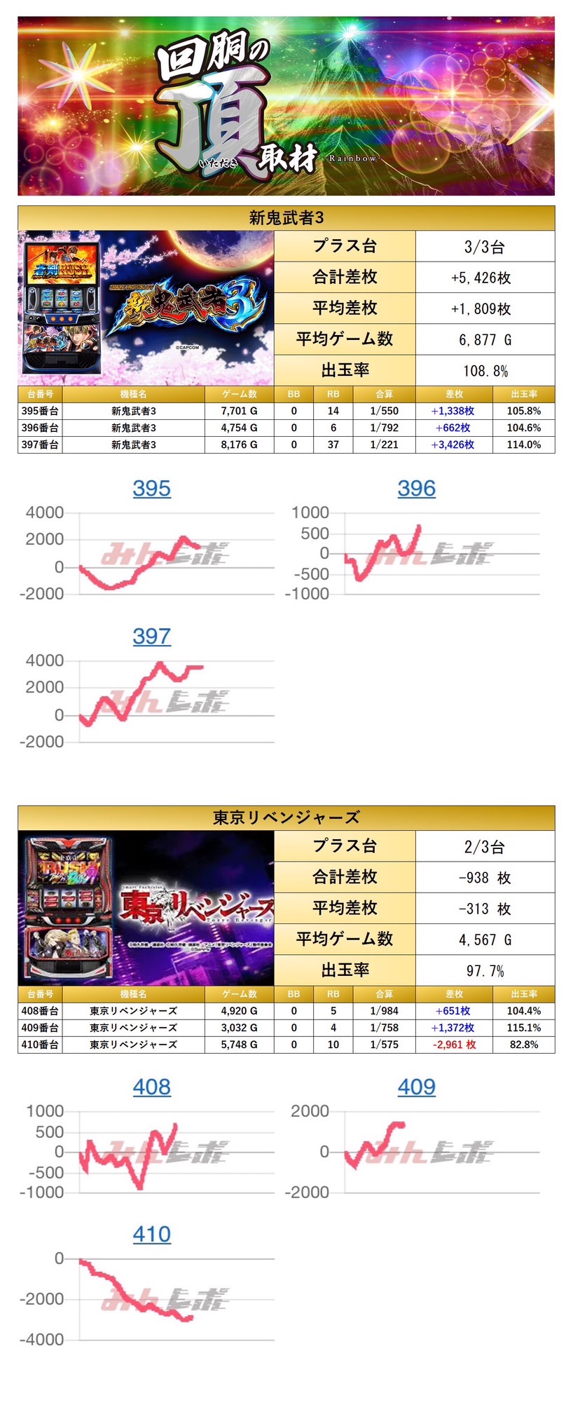 「新鬼武者3」「東京リベンジャーズ」の2機種をpick upする。2機種の平均差枚は+748枚で平均出率が104.4%だった。