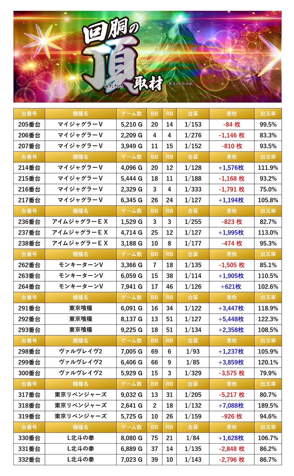随所から多彩な機種が2台pick upすることが出来た。2台の平均差枚は−6枚で平均出率が99.9%だった。