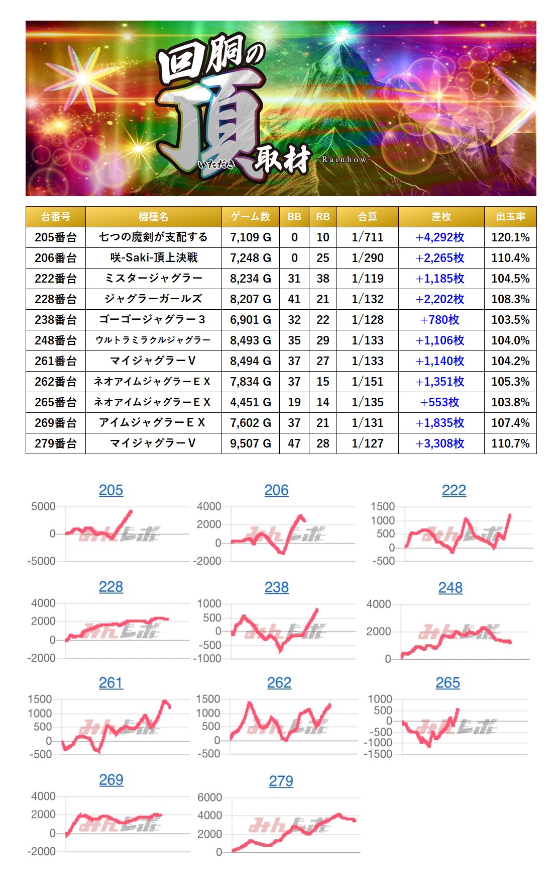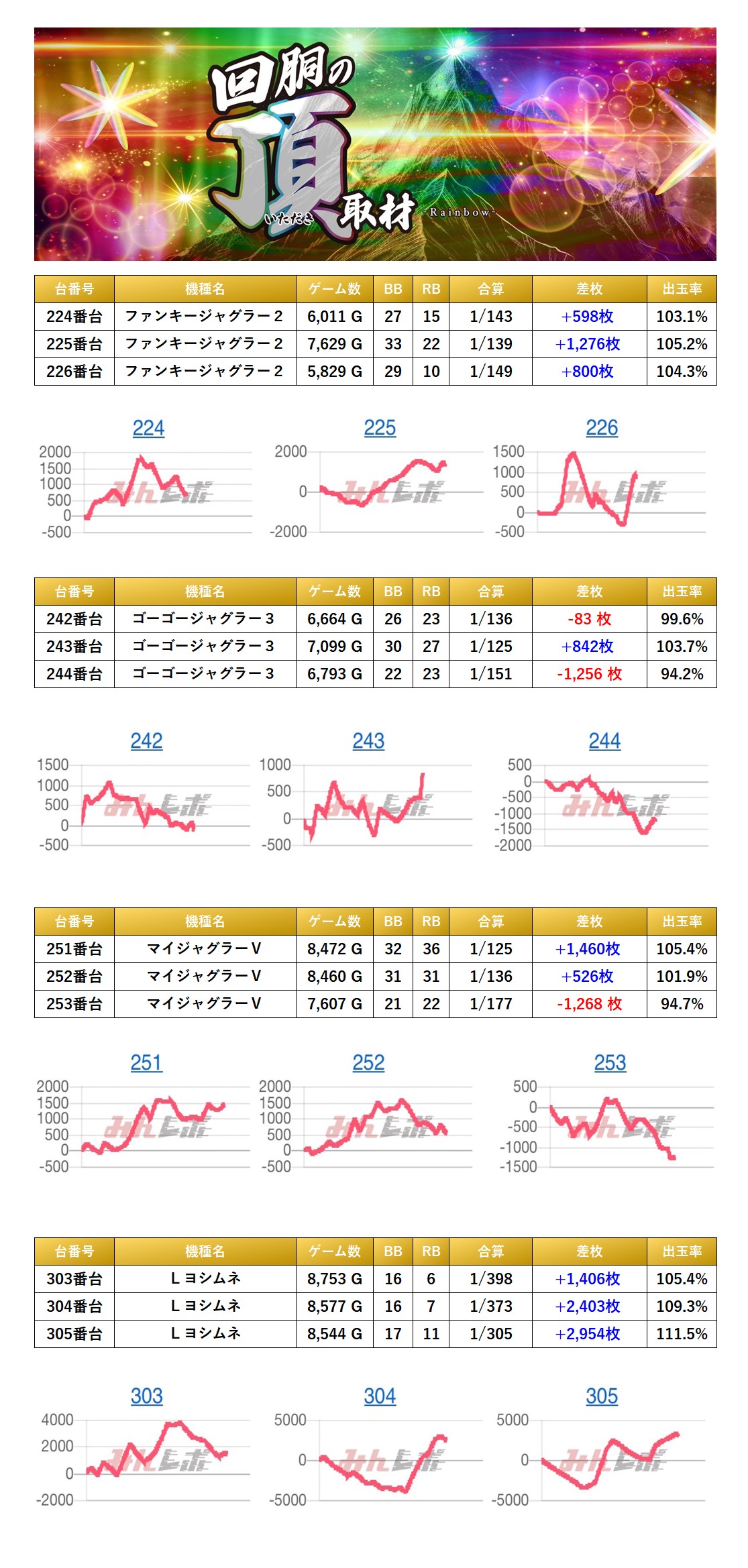スマスロ、メダル機から「3台並びを6箇所」、「4台並びが1箇所」、「5台並びが1箇所」の計8箇所を見つけることができた。8箇所の平均差枚は+1,590枚で平均出率が106.5%だった。