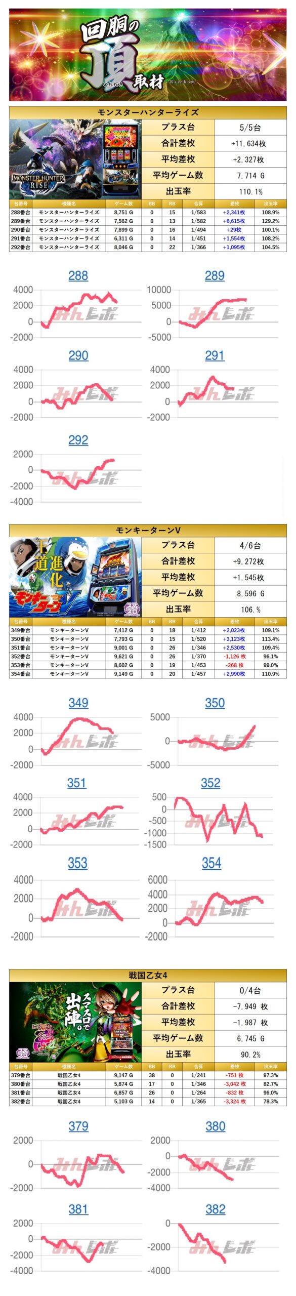 「モンハンライズ」「モンキーターン」「戦国乙女4」の3機種をpick upする。3機種15台の平均差枚は+864枚で平均出率が103.7%だった。