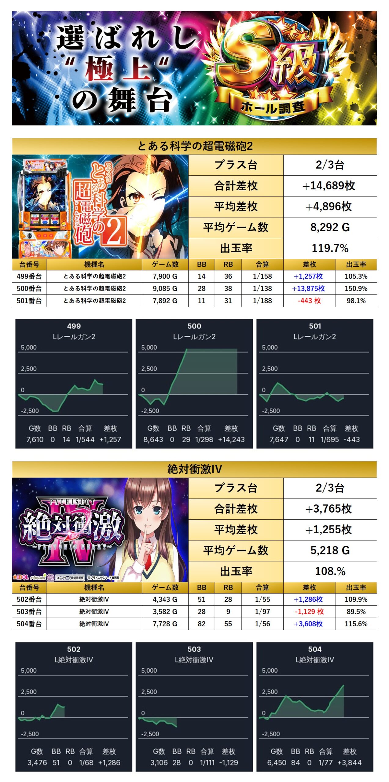 平均差枚+3,076枚、平均出率115.2%ととある科学の超電磁砲2はしっかり打ち込まれ素晴らしい出率だった。