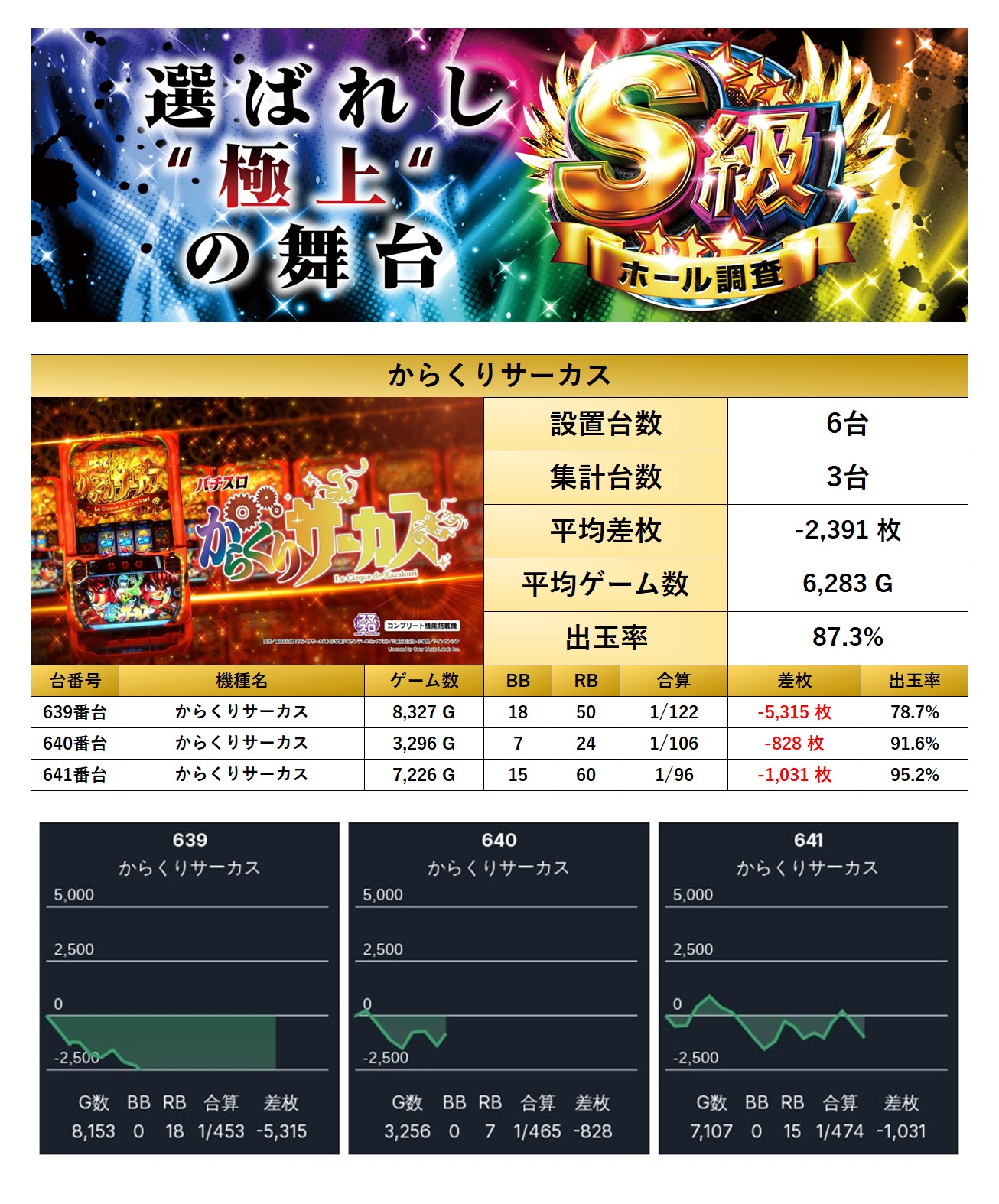 平均差枚−127枚、平均出率99.3%と展開に恵まれず、控えめな結果に。