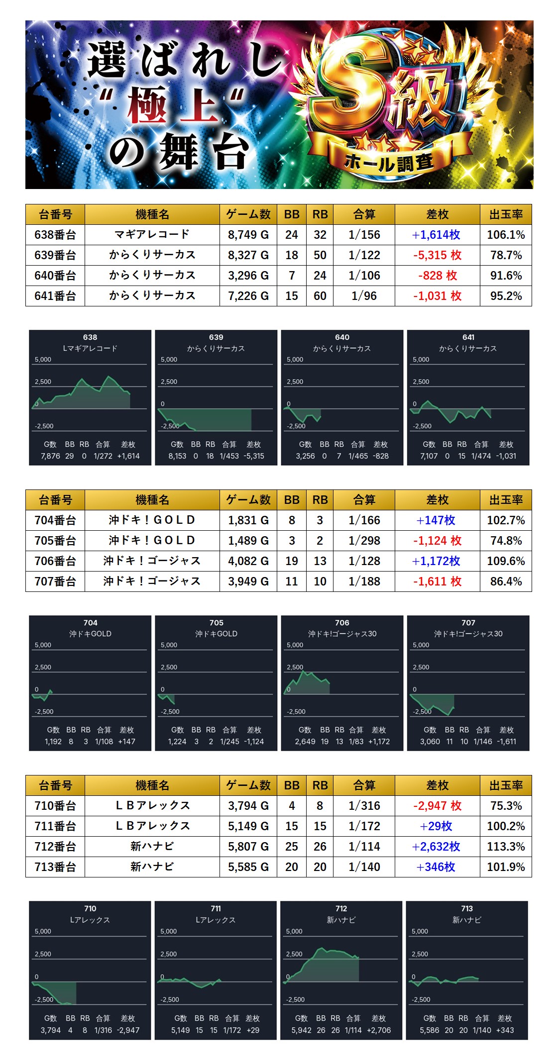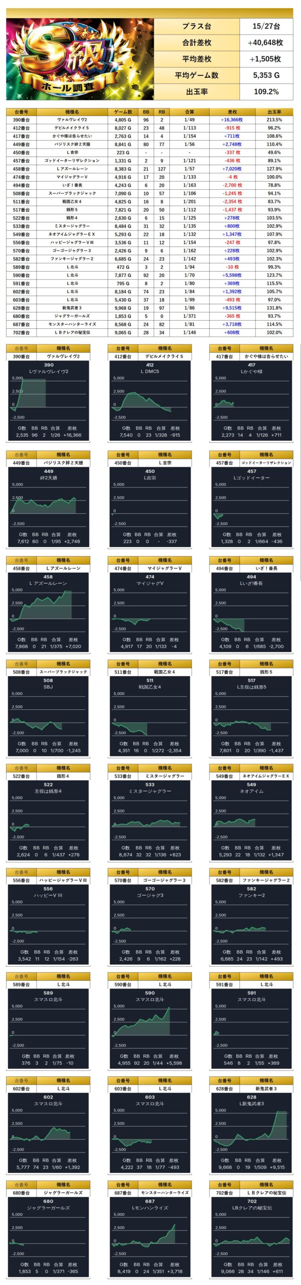 平均差枚+1,505枚、平均出率109.2%と、随所から多彩な人気機種がpick upされた。
