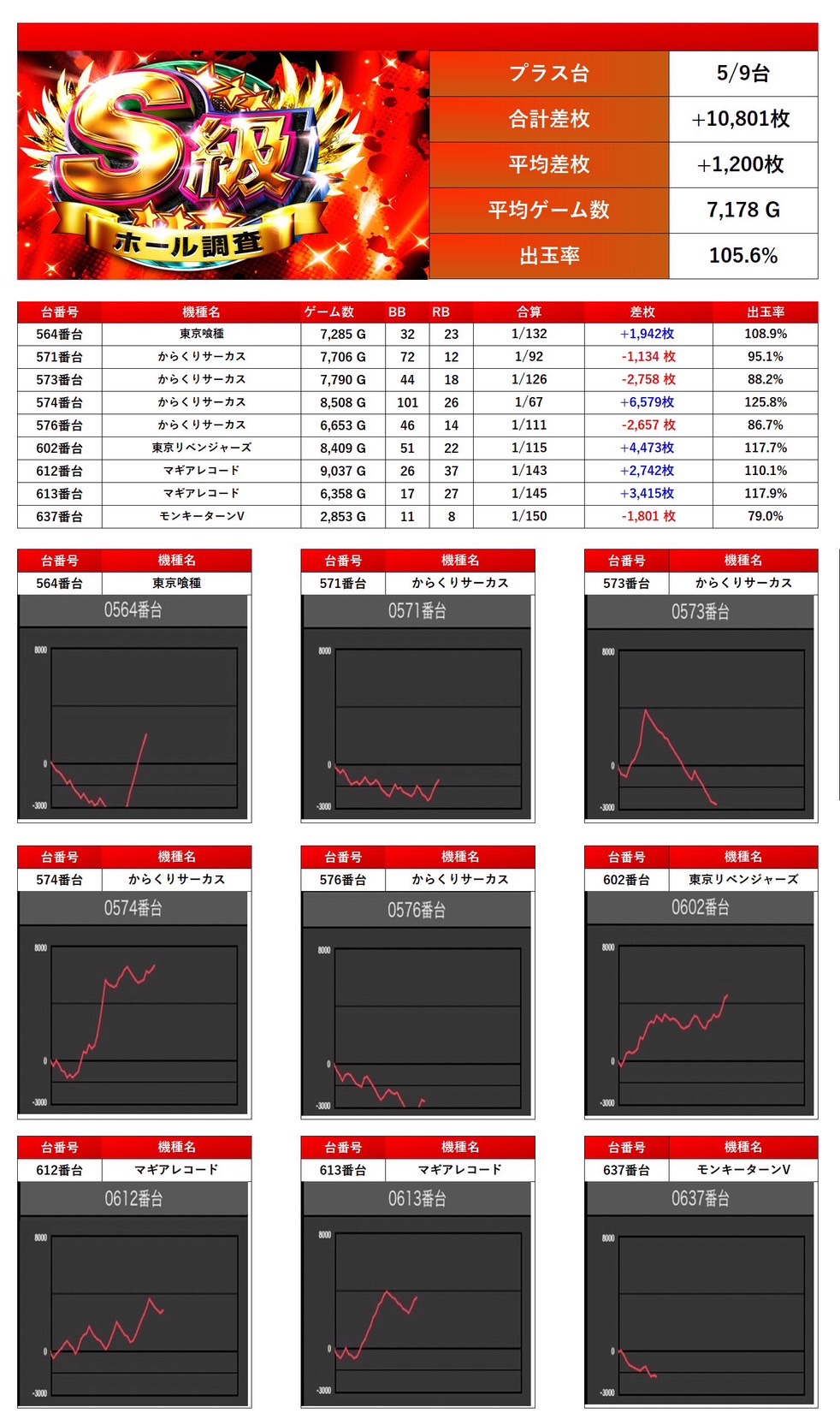 「東京喰種」「モンキー」「からくり」「東京リベンジャーズ」「マギレコ」から9台をpick up。平均差枚+1,200枚、平均出率105.6%だった。