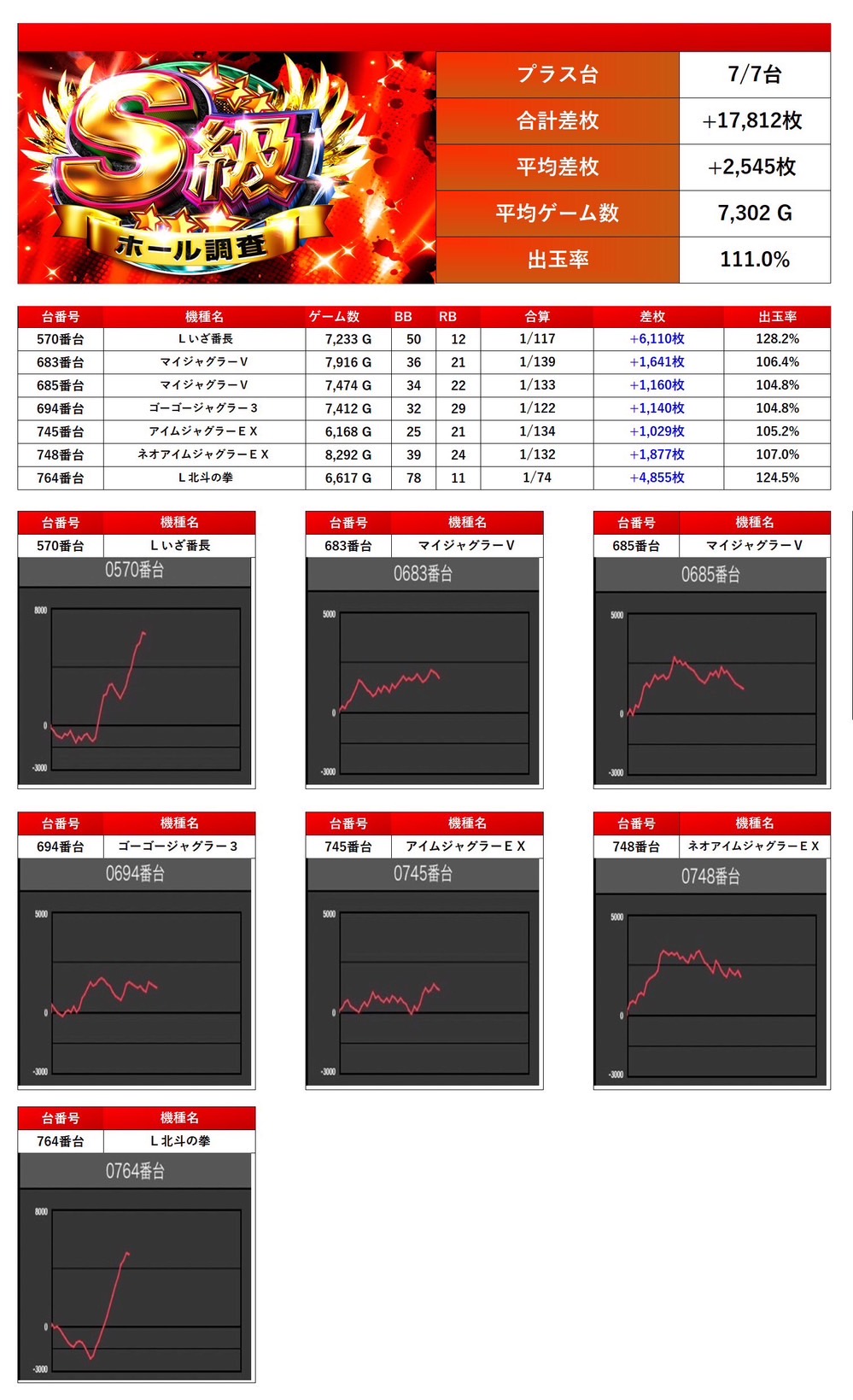 平均差枚+2,545枚、平均出率111.0%となった。各台まとまった出玉を持っており、しっかりとホールの雰囲気を盛り上げる要因となっていた。