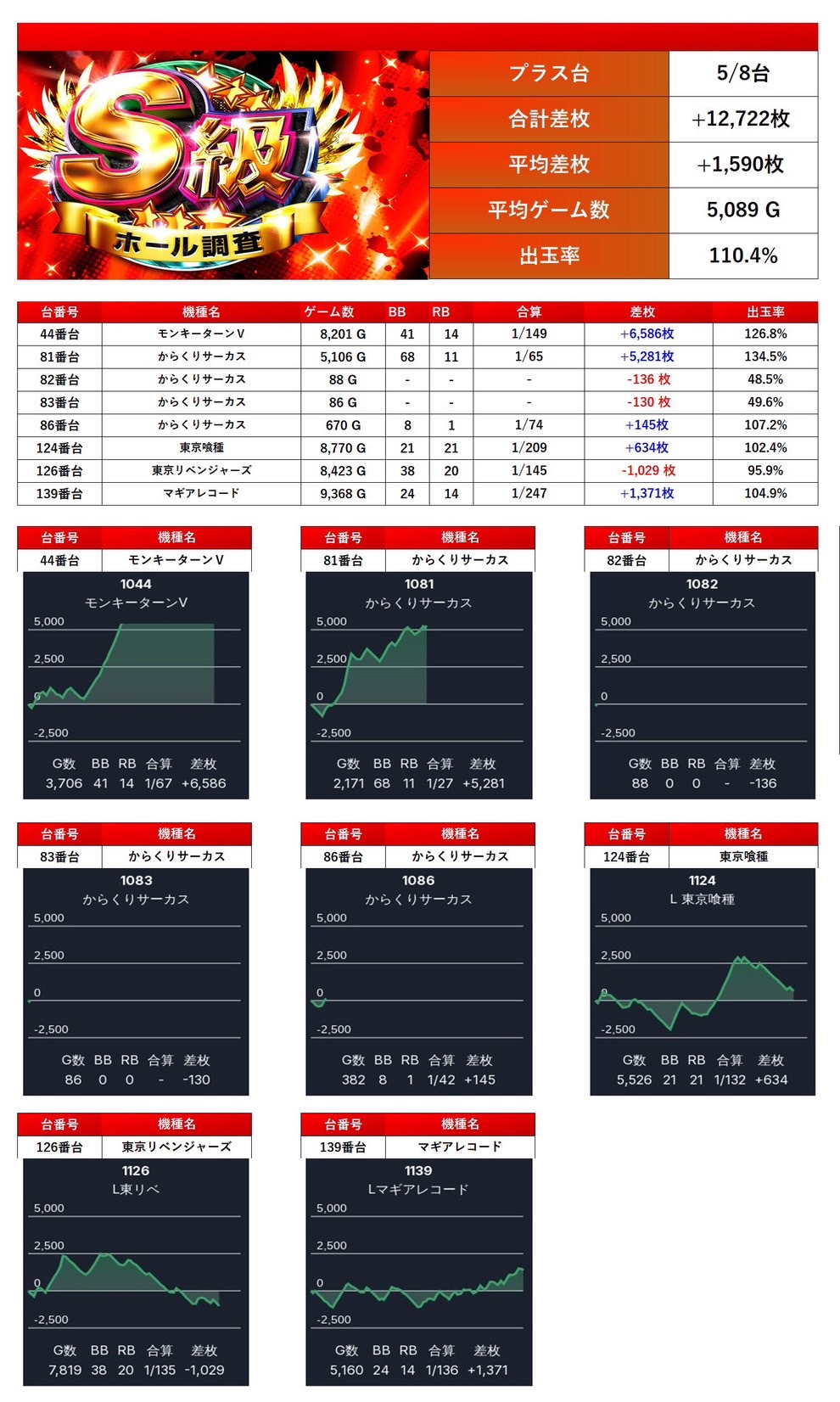 「東京喰種」「モンキー」「からくり」「東京リベンジャーズ」「マギレコ」から8台をpick up。平均差枚+1,590枚、平均出率110.4%だった。